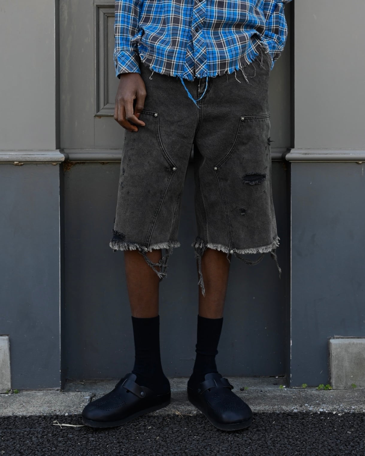 MH051 Damaged work shorts / BLACK DENIM