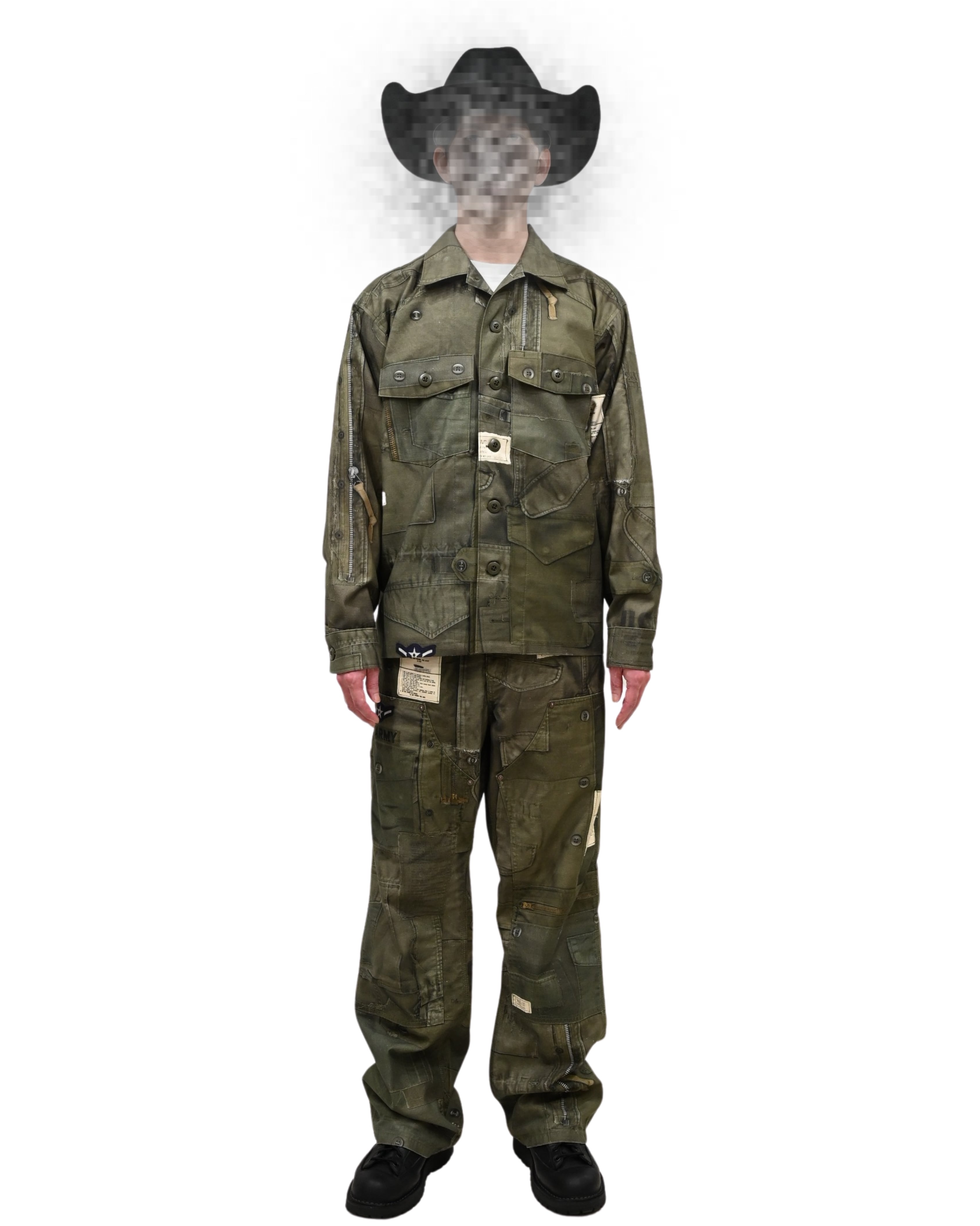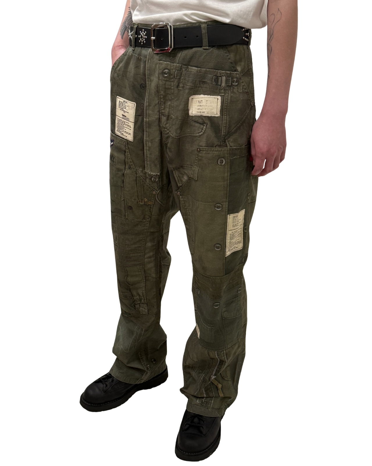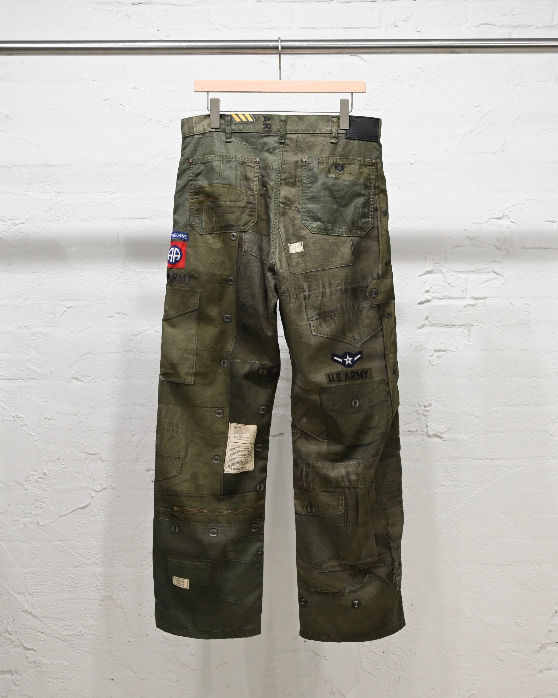 デザイナー自身が古着のミリタリー生地をパッチワークし縫製、その生地をプリントに落とし込んだパンツ。