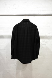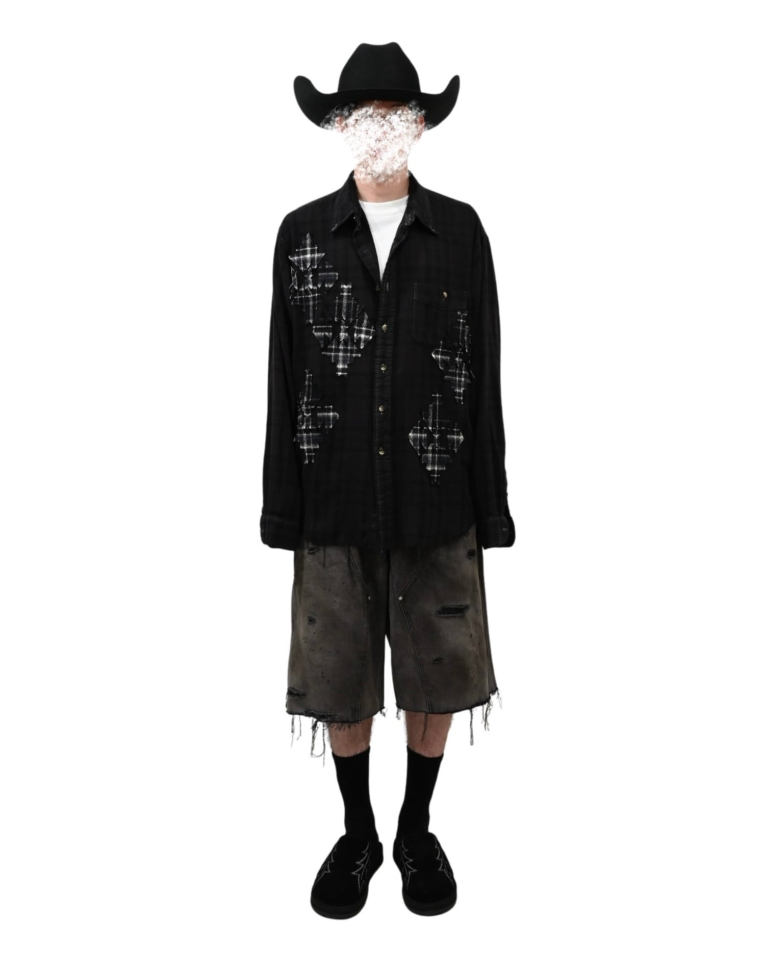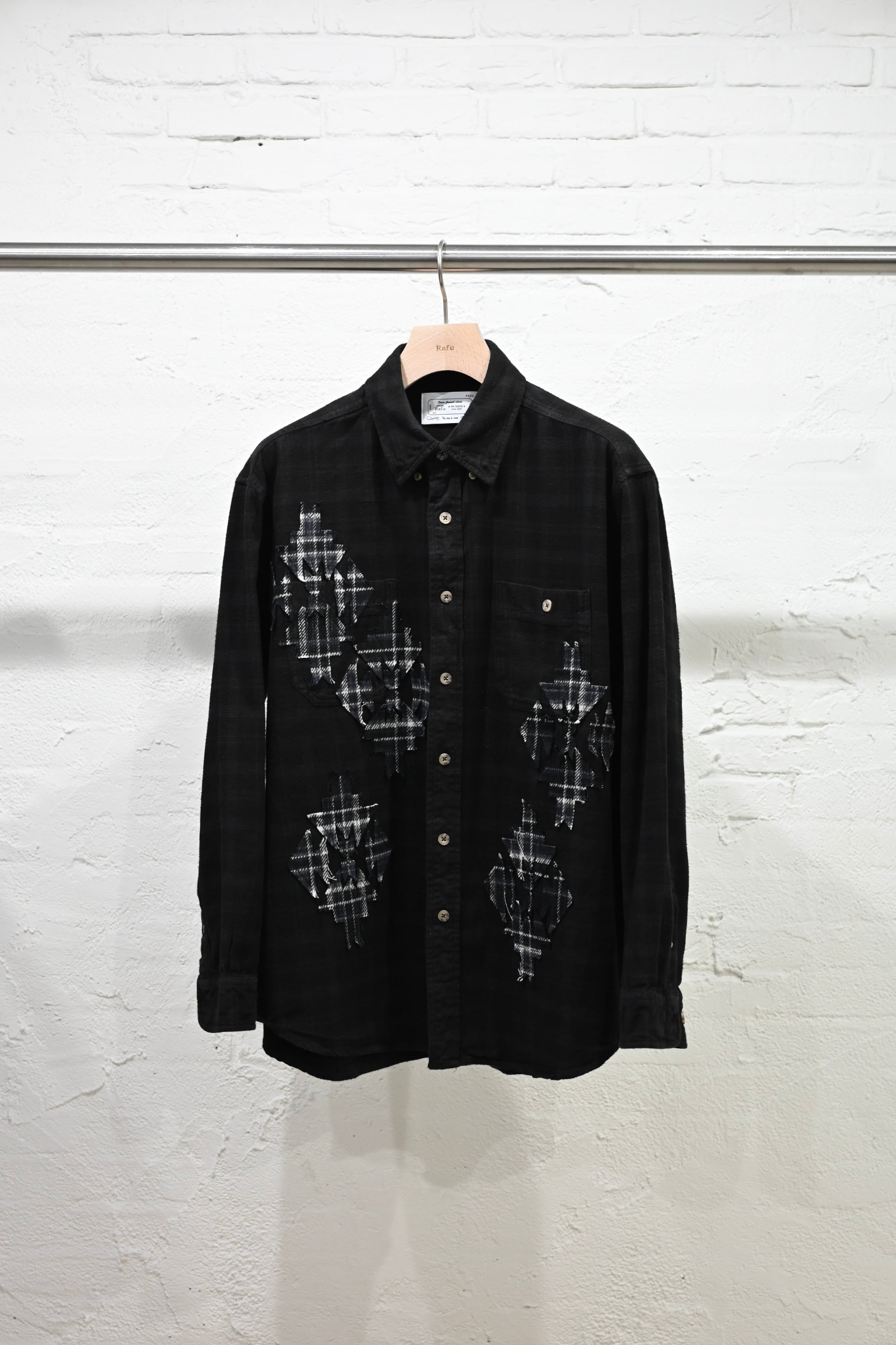 古着のネルシャツを黒染めしたシャツ。オリジナルのネイティブ柄を縫い付けています。