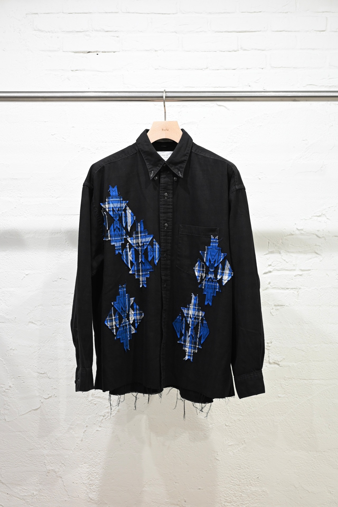 古着のネルシャツを黒染めしたシャツ。オリジナルのネイティブ柄を縫い付けています。