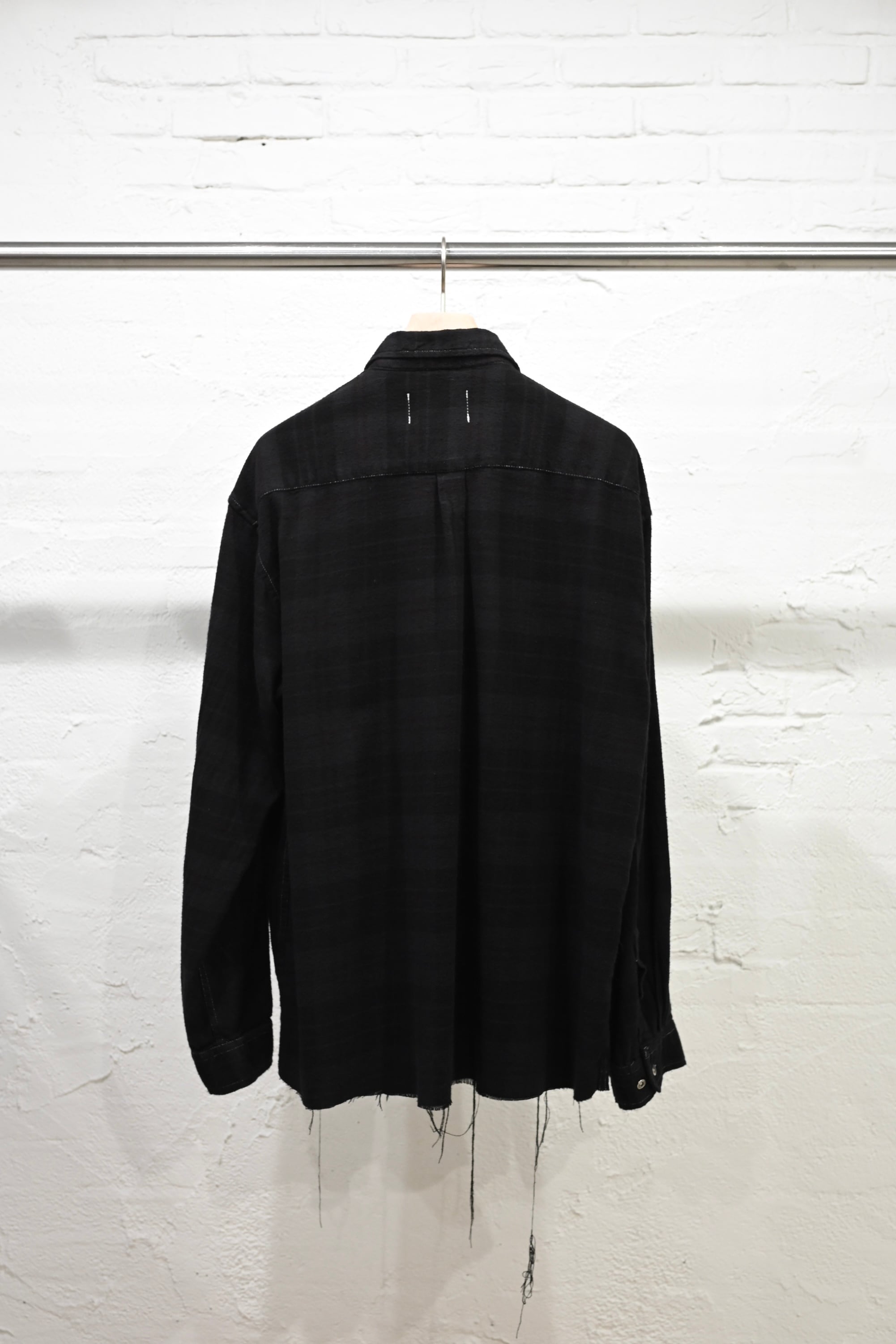 古着のネルシャツを黒染めしたシャツ。オリジナルのネイティブ柄を縫い付けています。