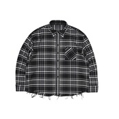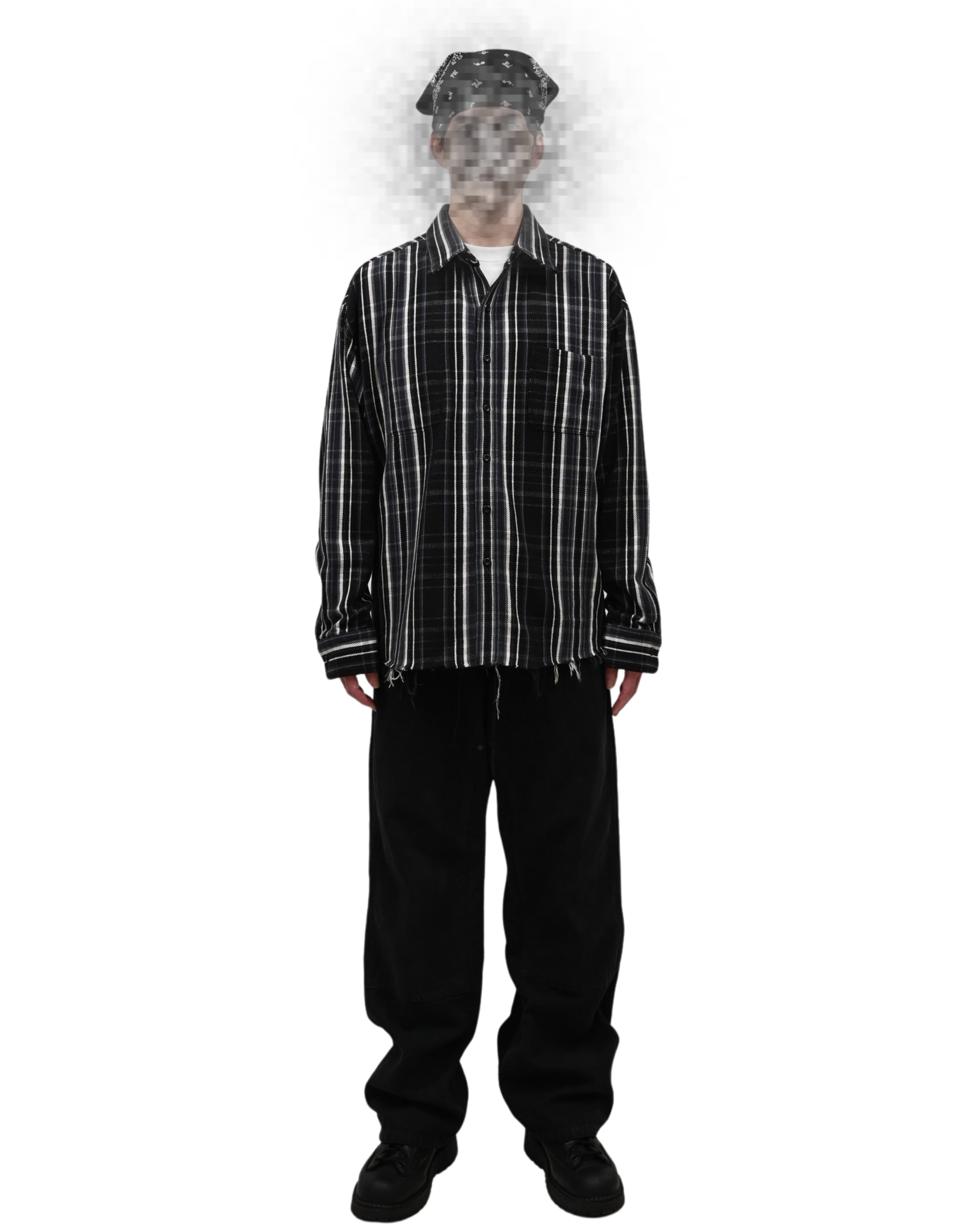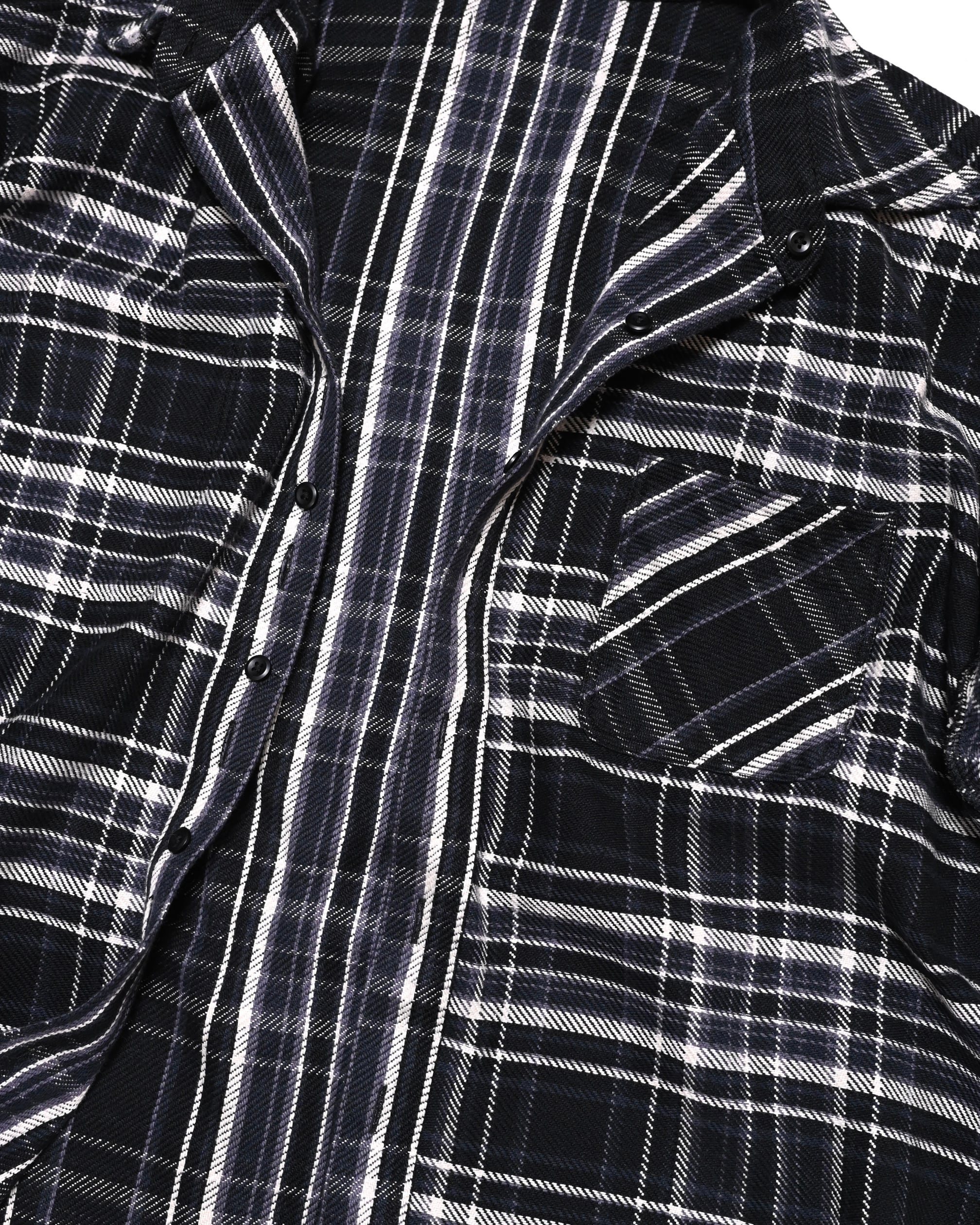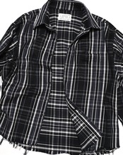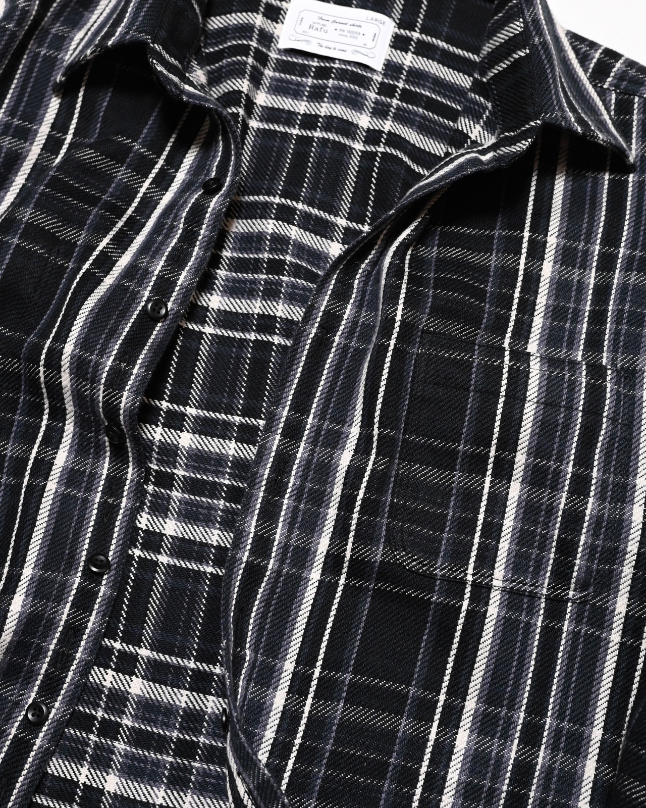 表面ストライプ柄、裏面チェック柄のリバーシブルネルシャツ。