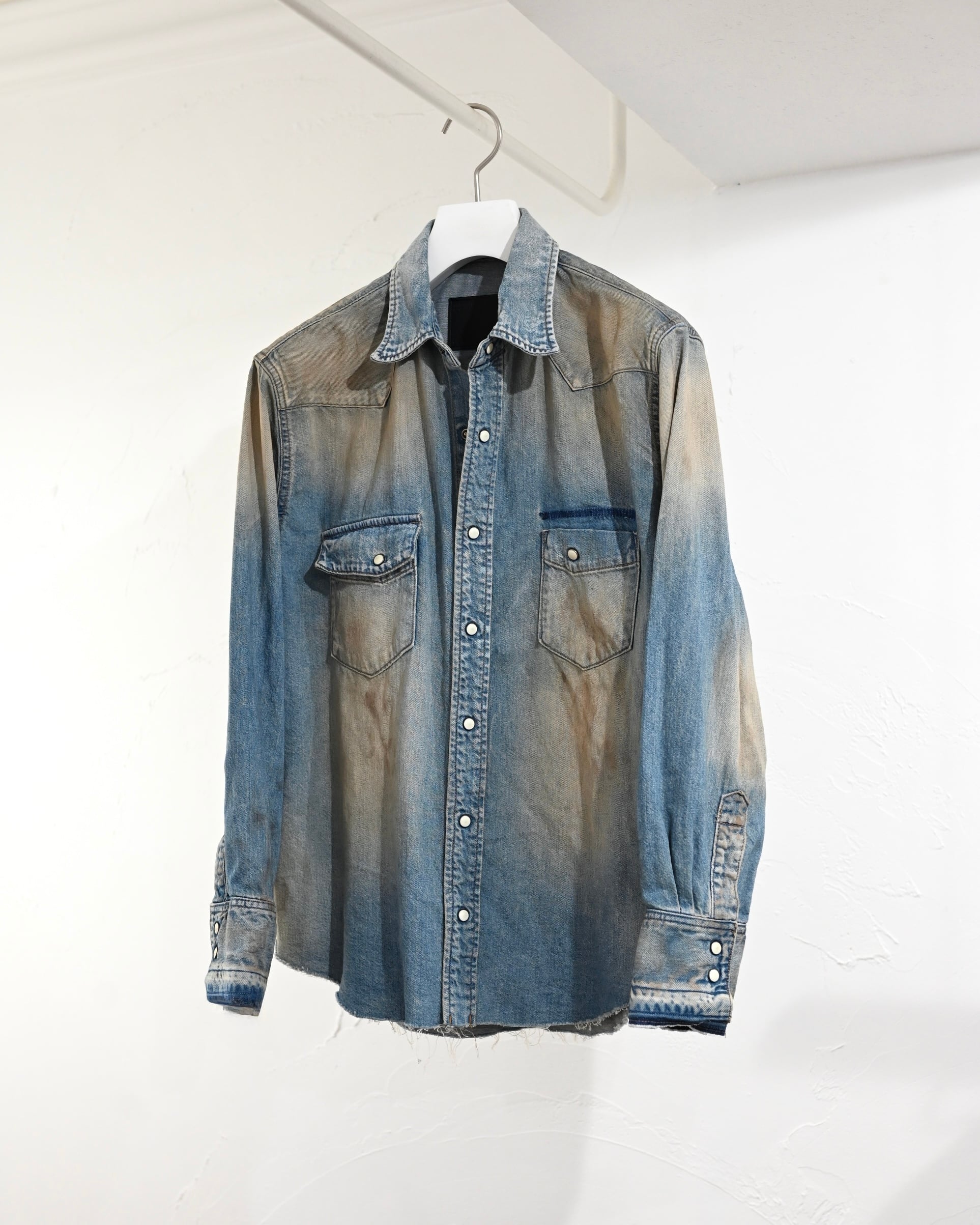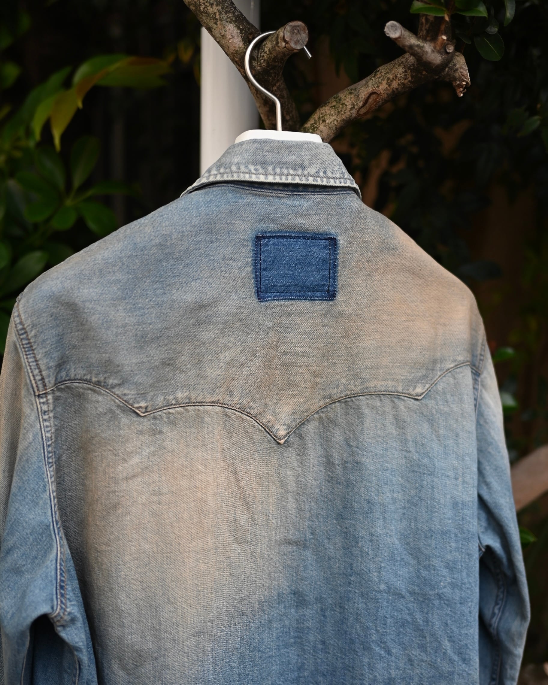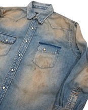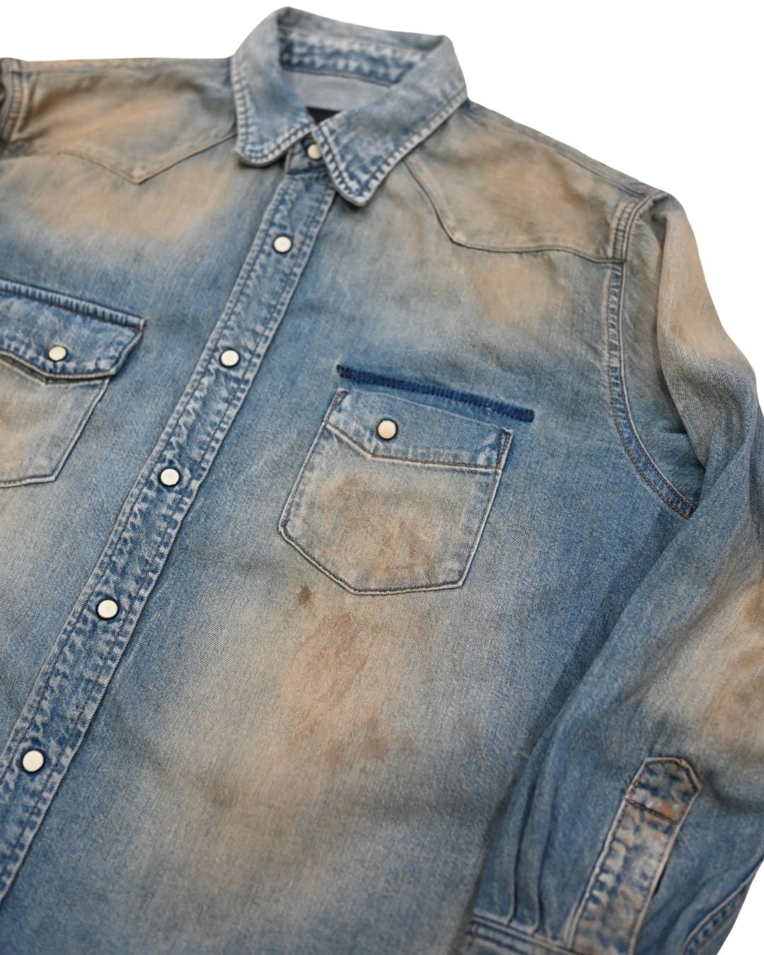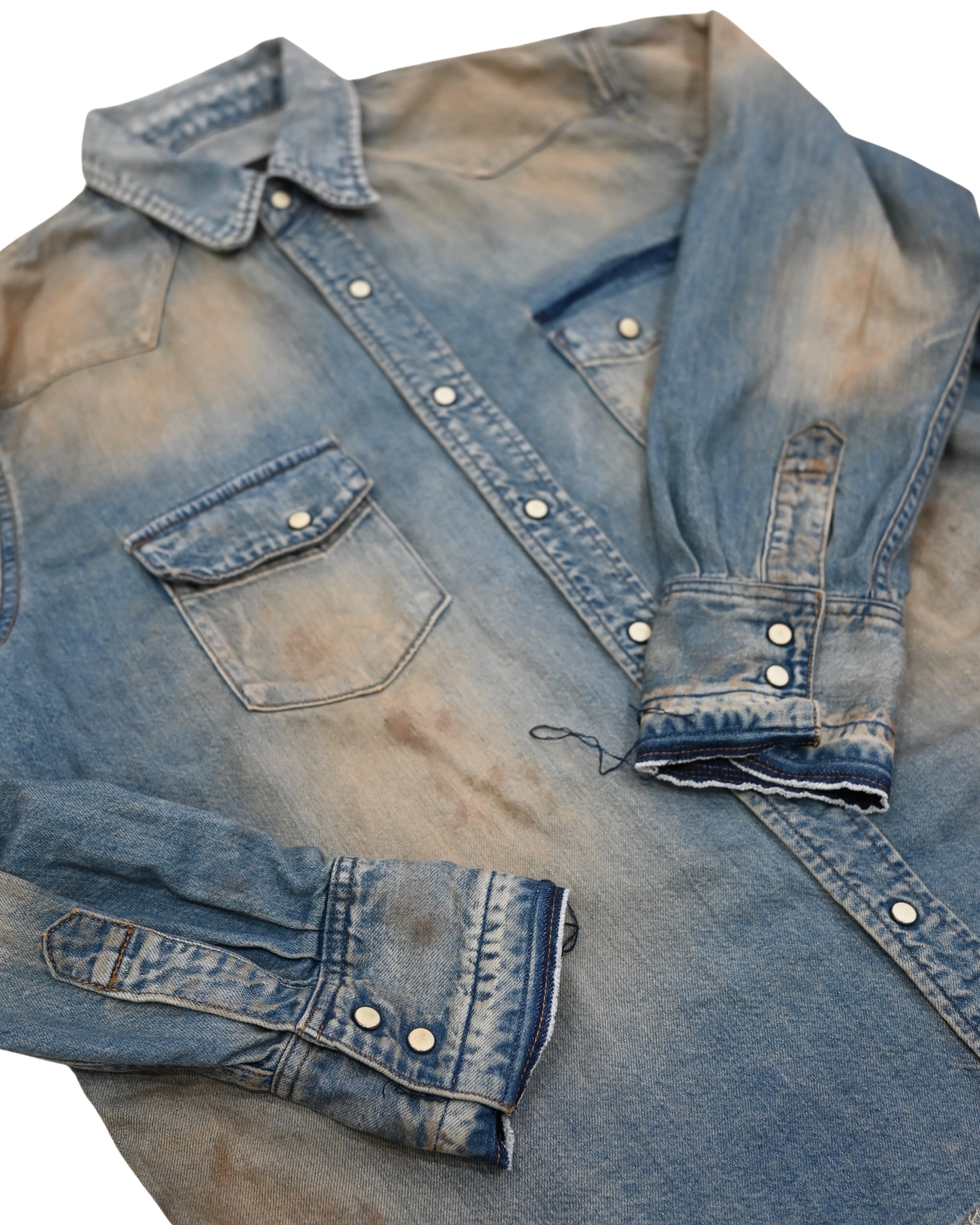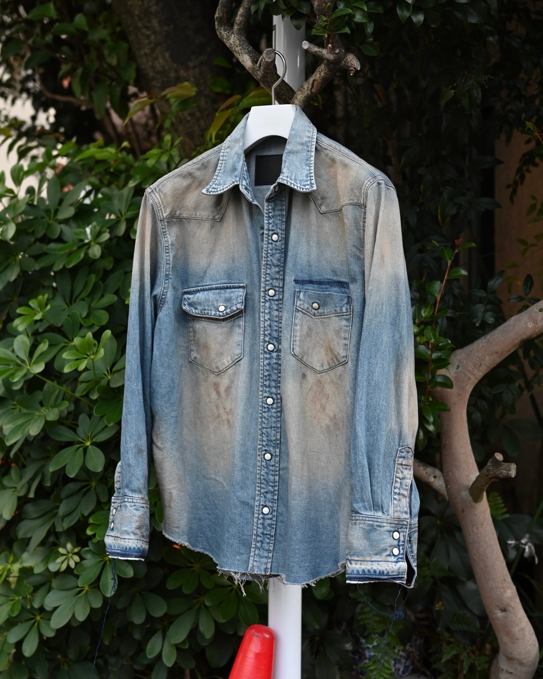 今回のアイテムは、彼自身が長年コレクションしてきた私物のデニムシャツをベースに、そのリアルな汚しや風合いをハンドワークで丁寧に再現した一着です。