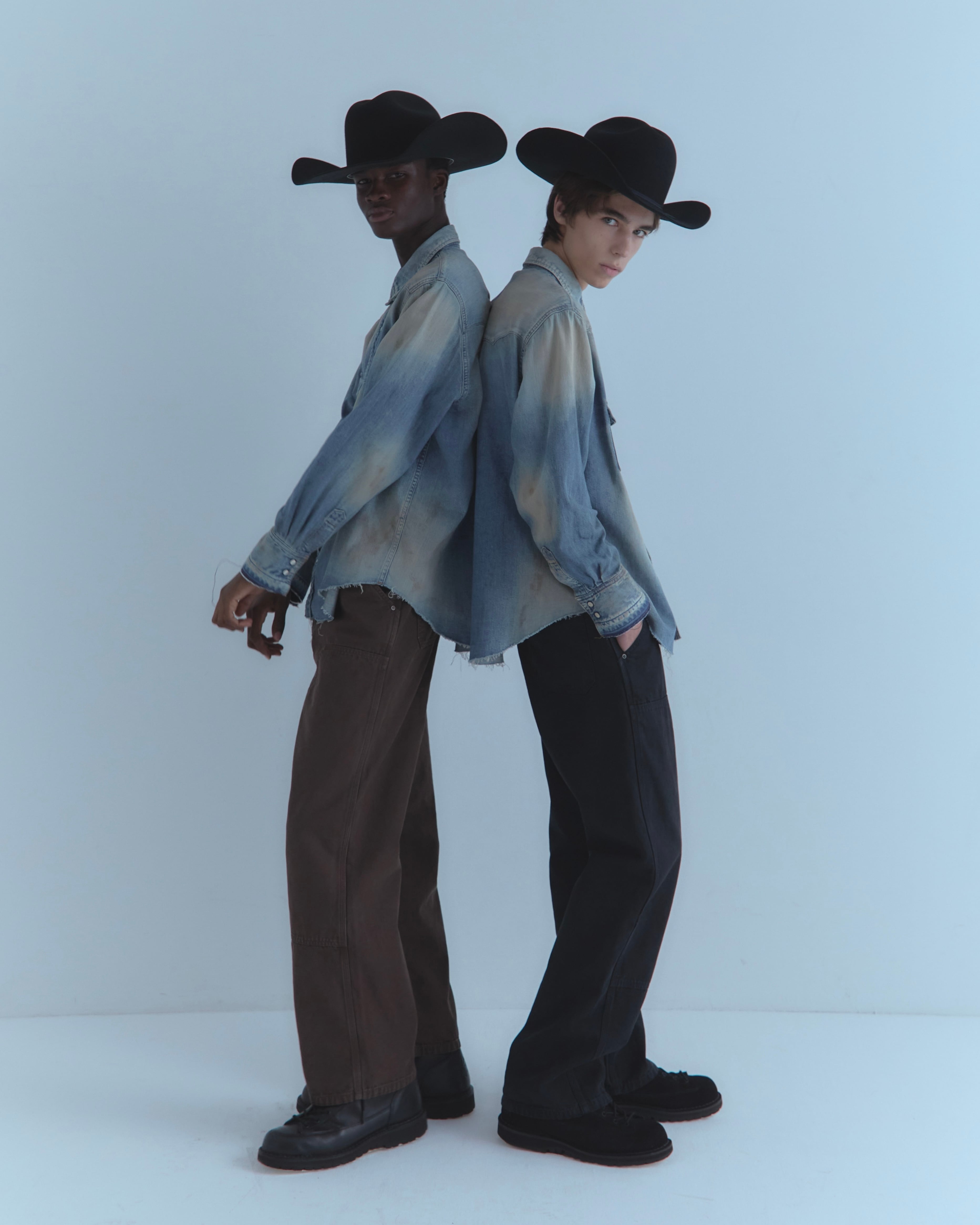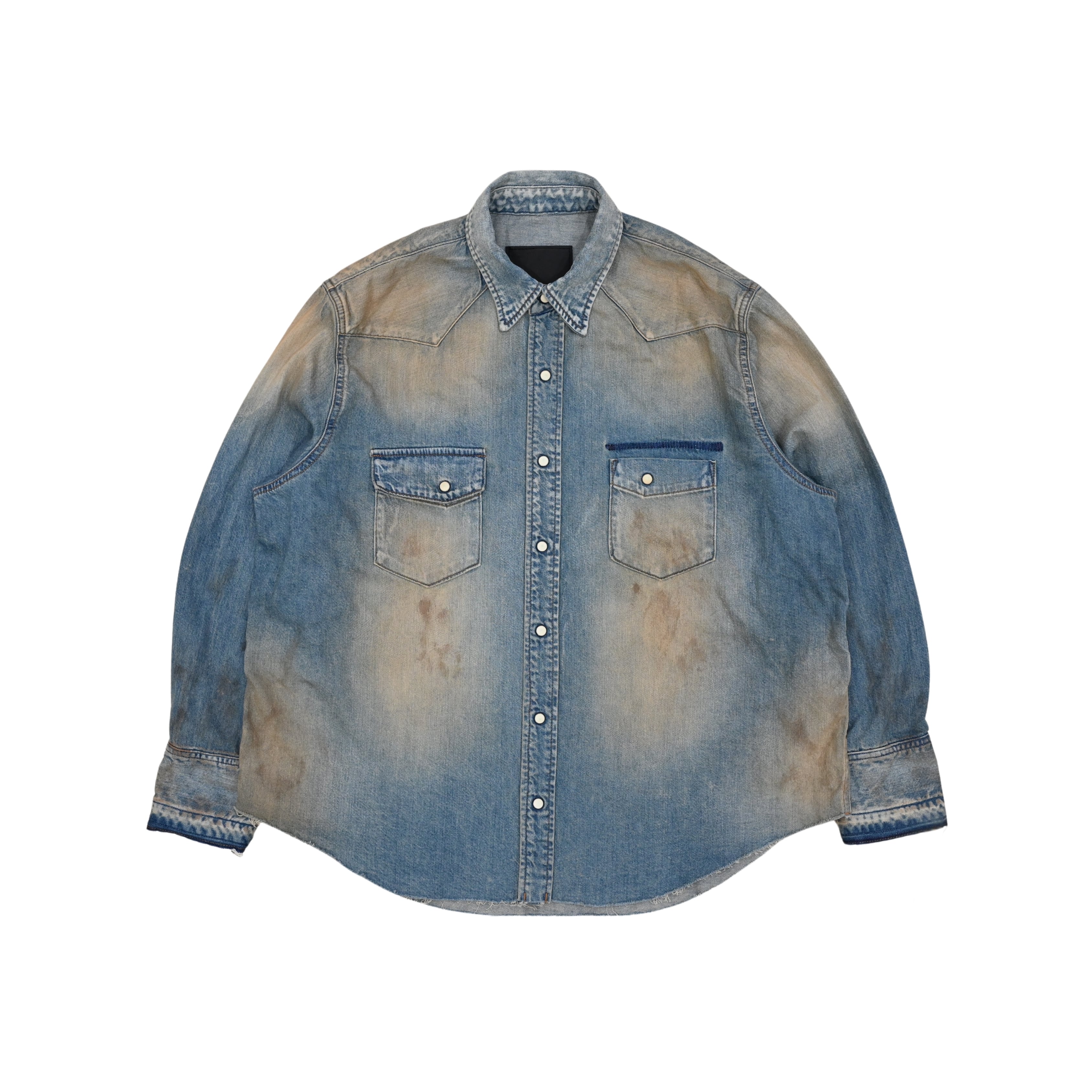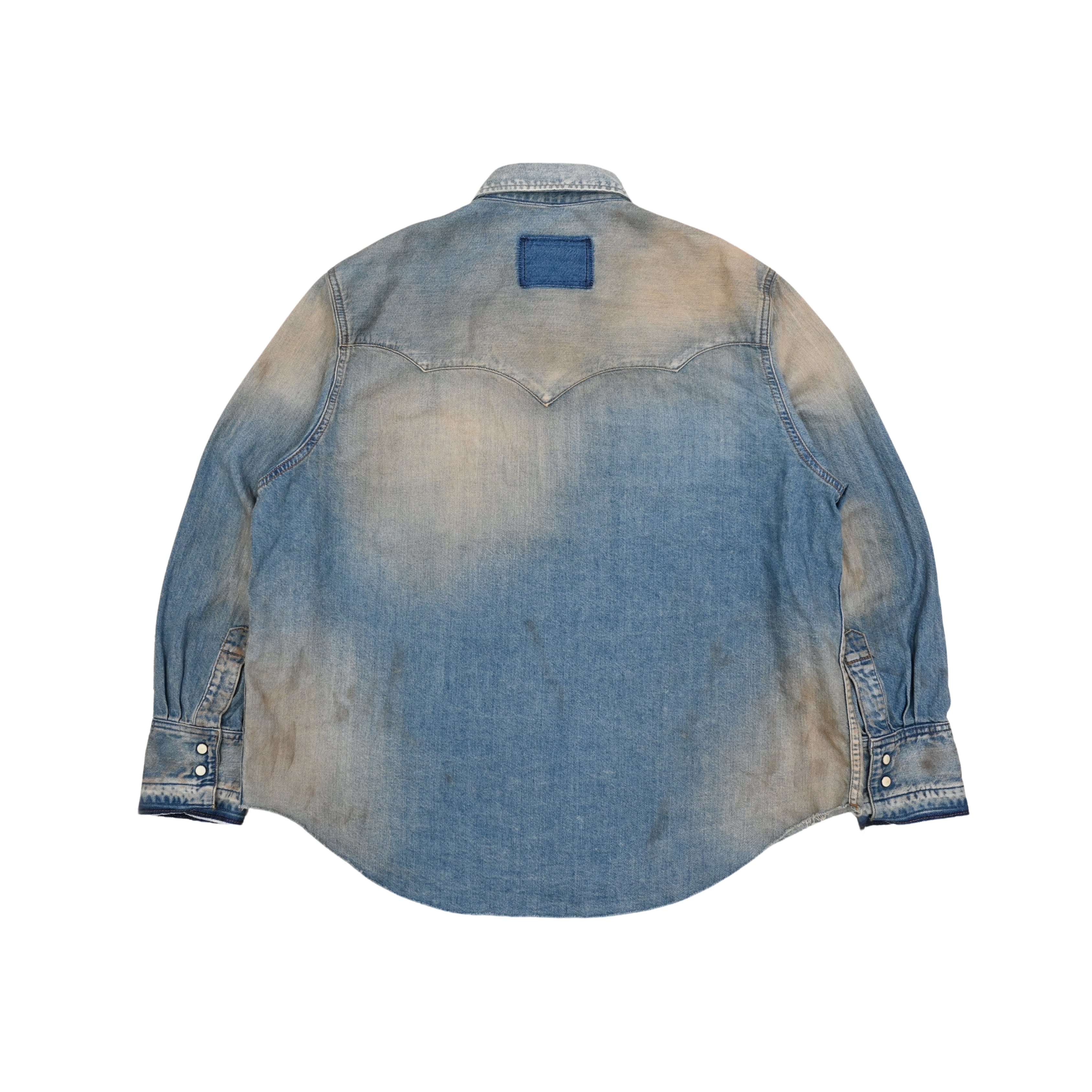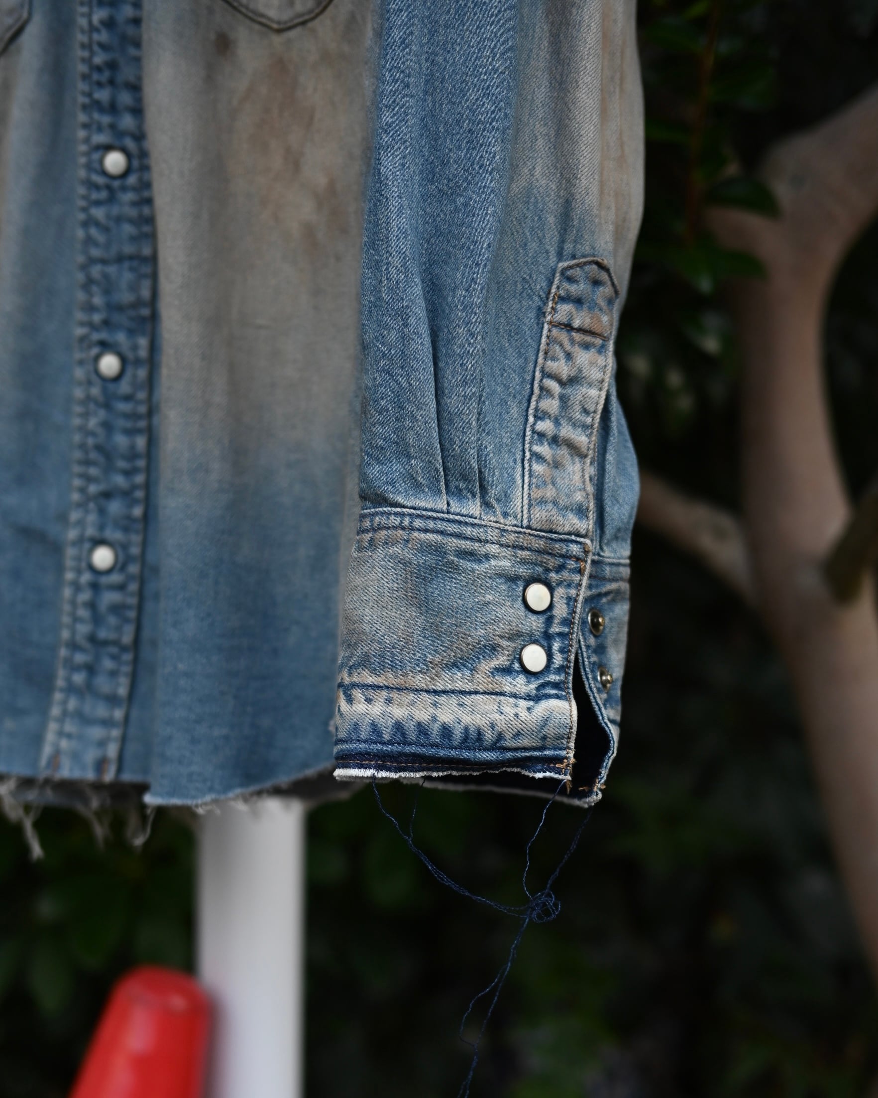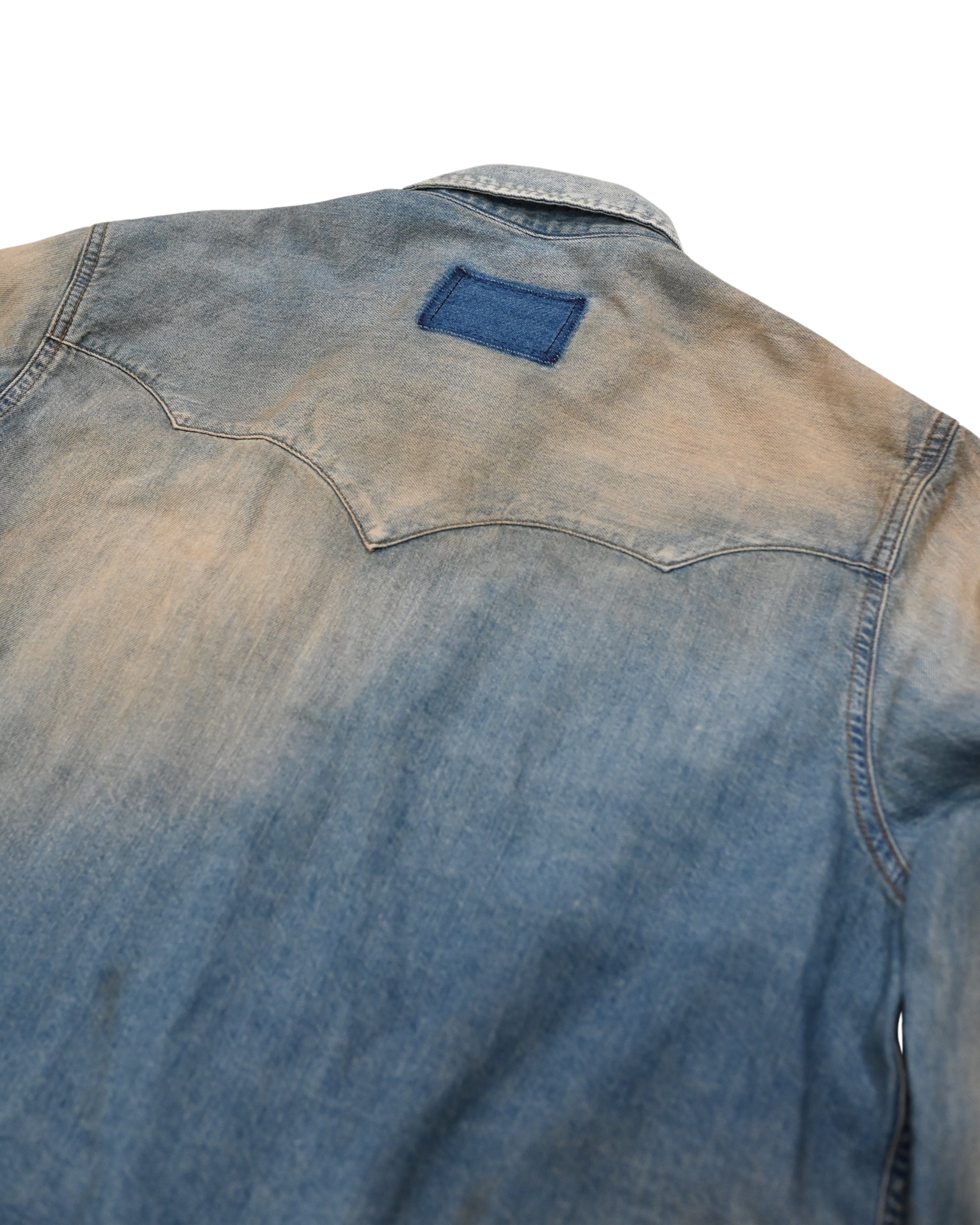 今回のアイテムは、彼自身が長年コレクションしてきた私物のデニムシャツをベースに、そのリアルな汚しや風合いをハンドワークで丁寧に再現した一着です。