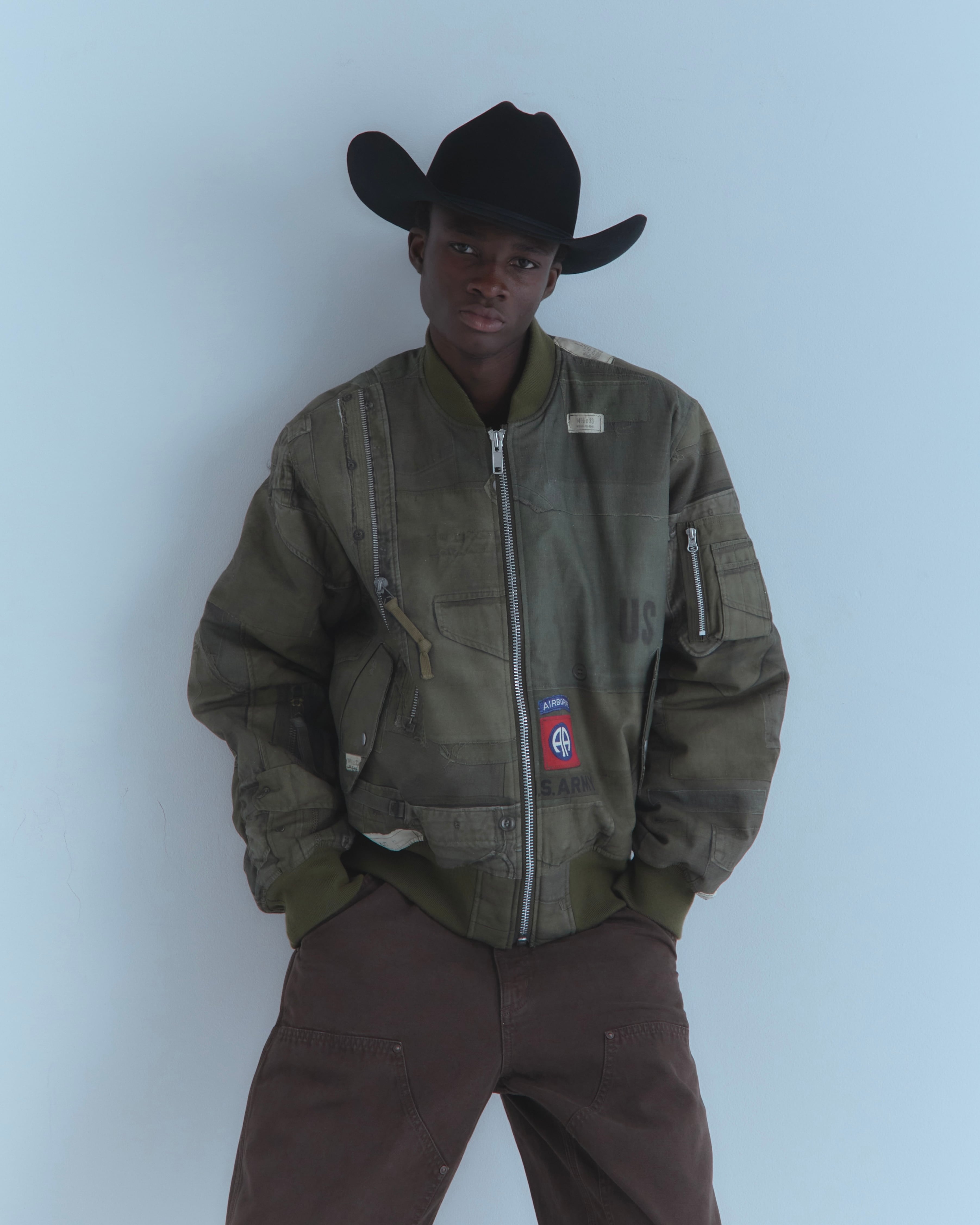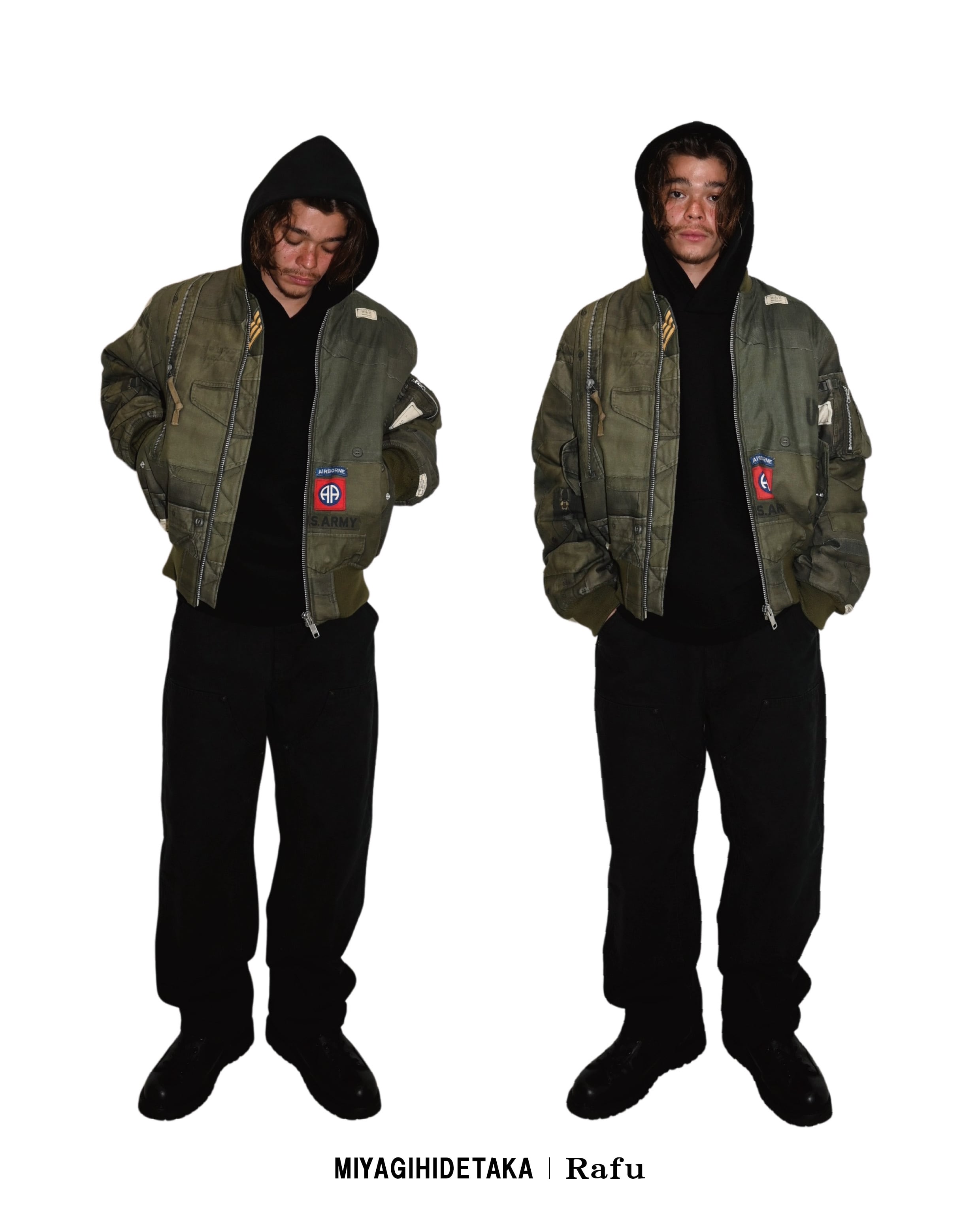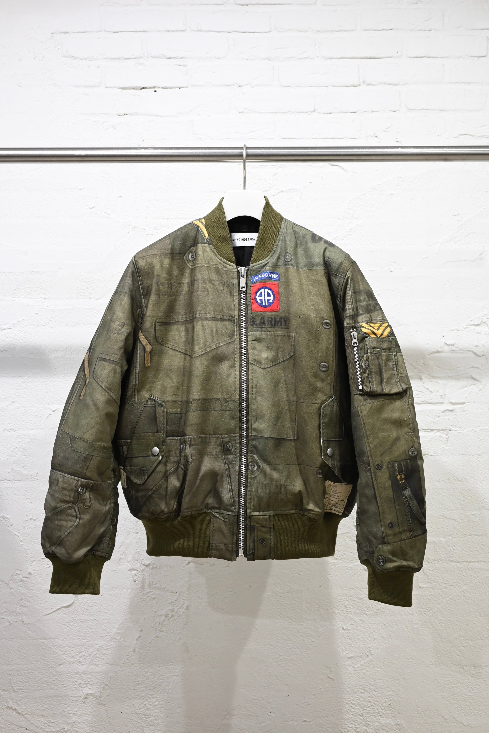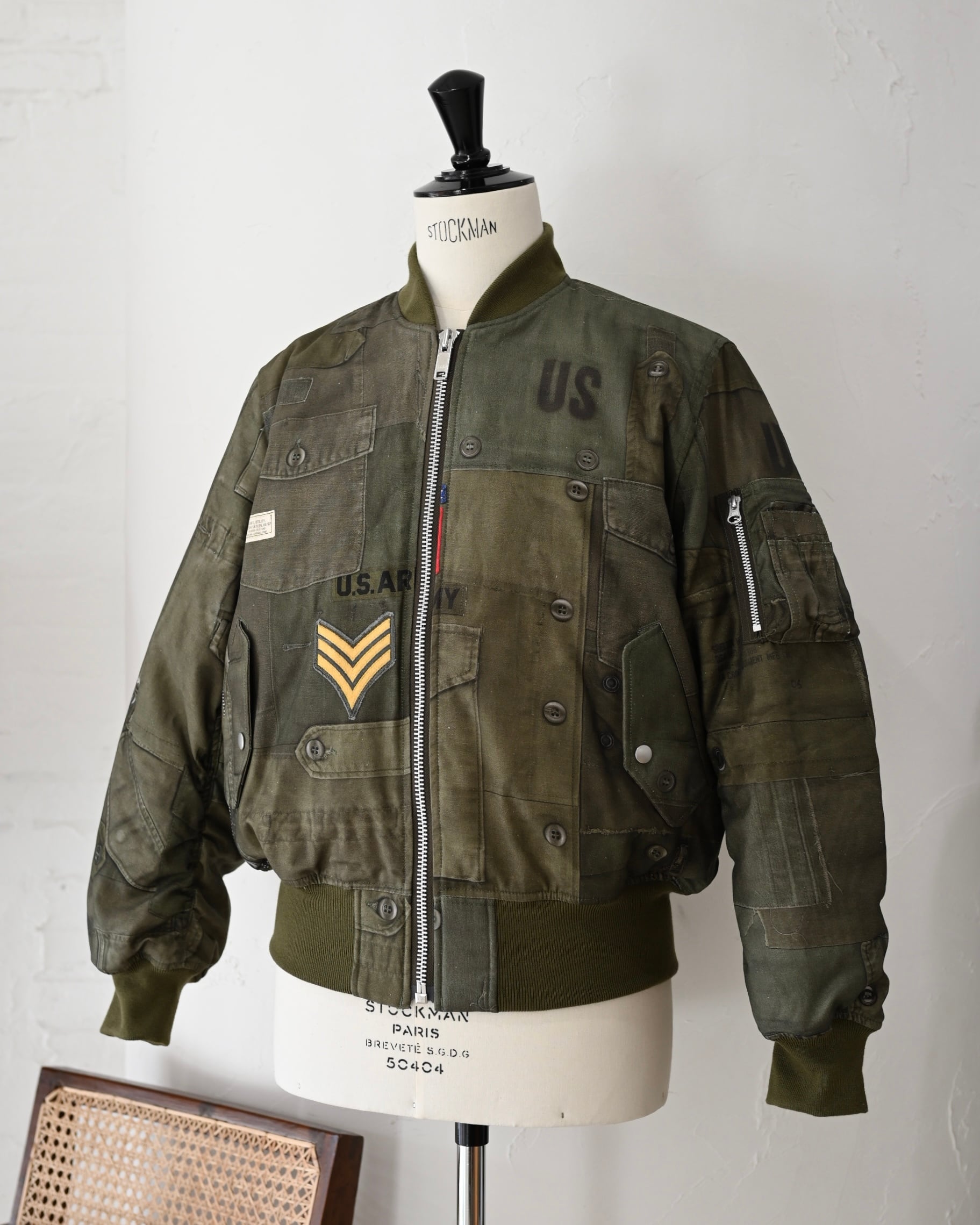 デザイナー自身が古着のミリタリー生地をパッチワークし縫製、その生地をプリントに落とし込んだMA-1。