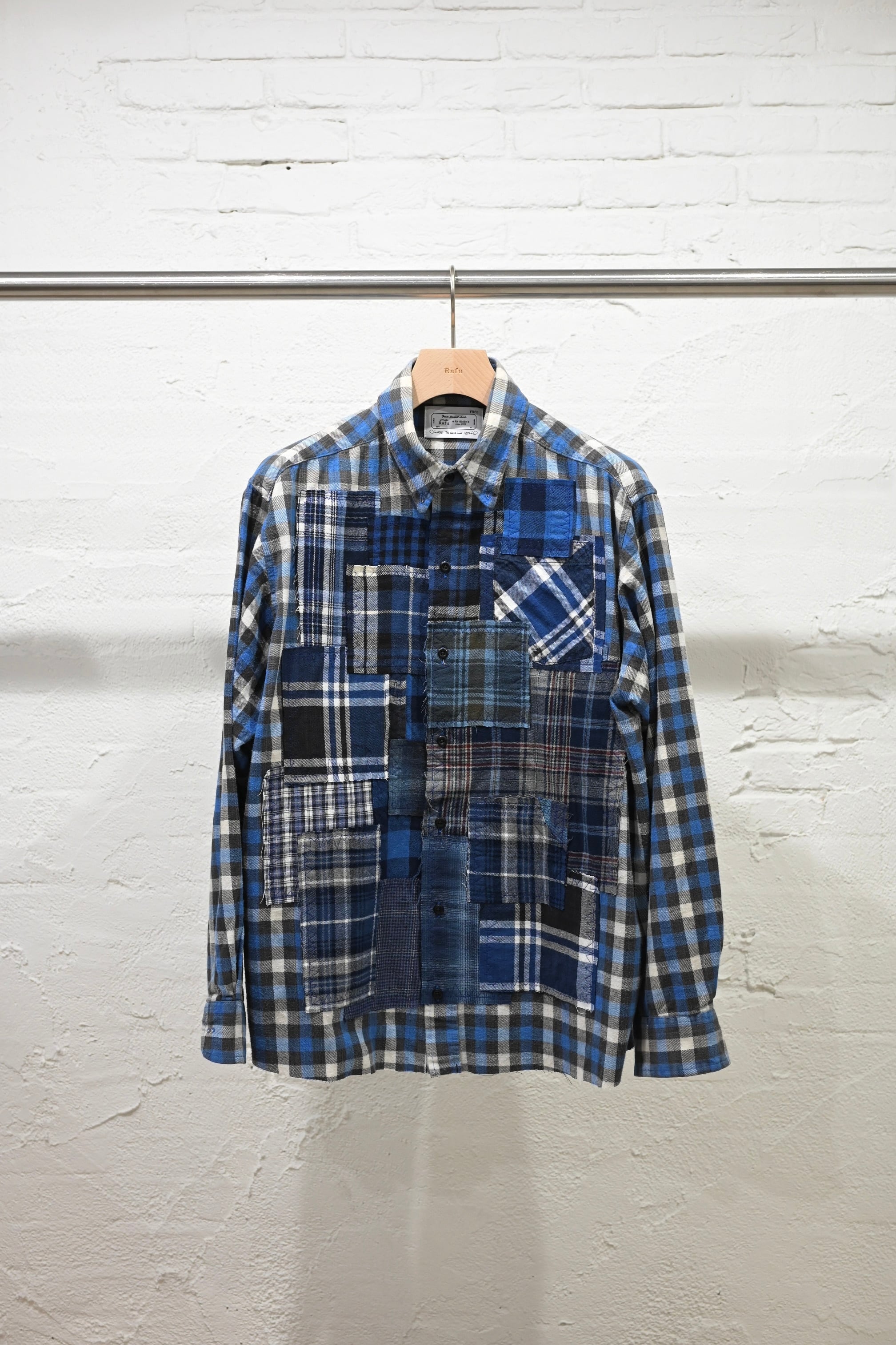 16種類のネル柄を組み合わせたパネルパッチワークの一着は、すべてが一点もの。ギザステッチ