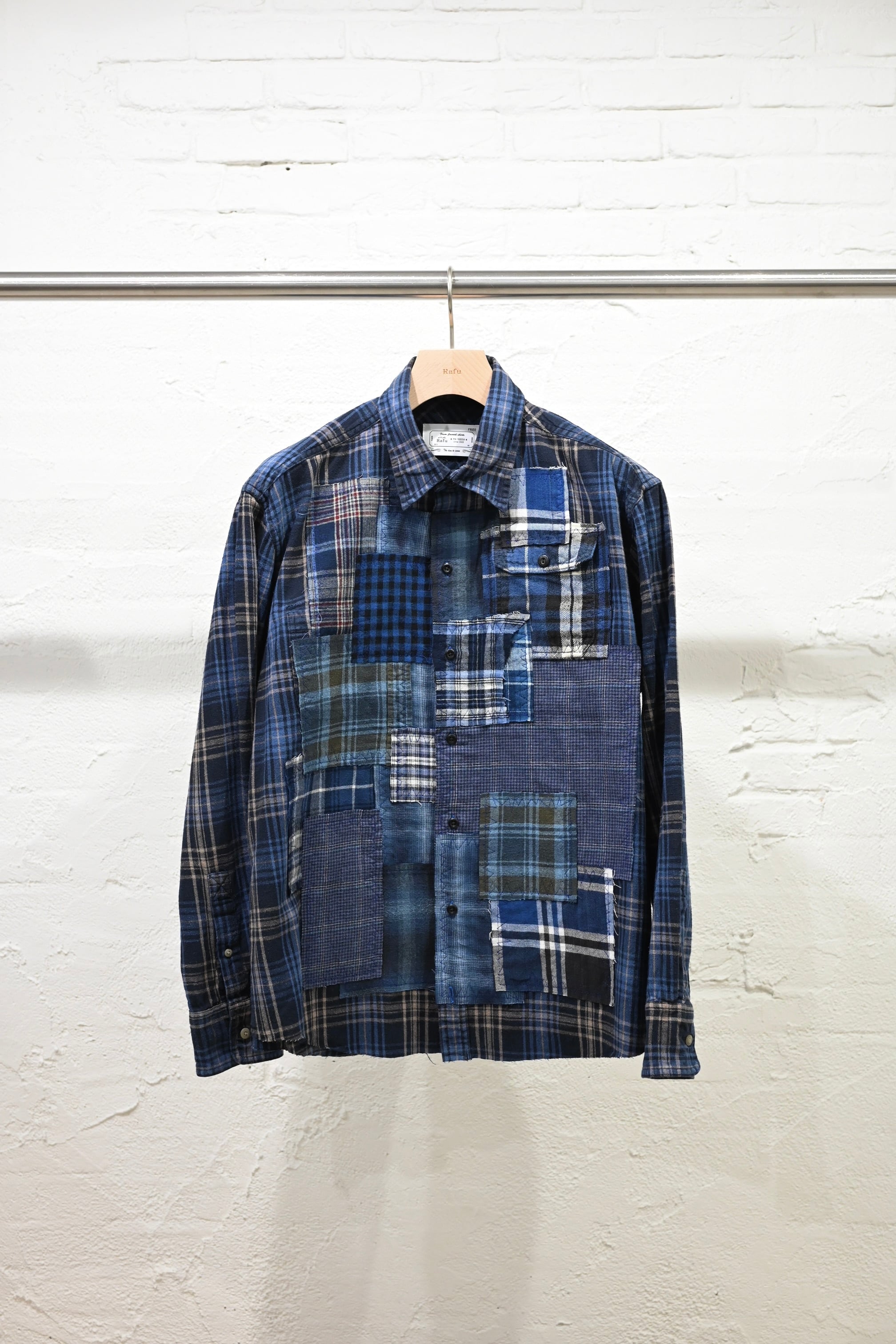 16種類のネル柄を組み合わせたパネルパッチワークの一着は、すべてが一点もの。ギザステッチ