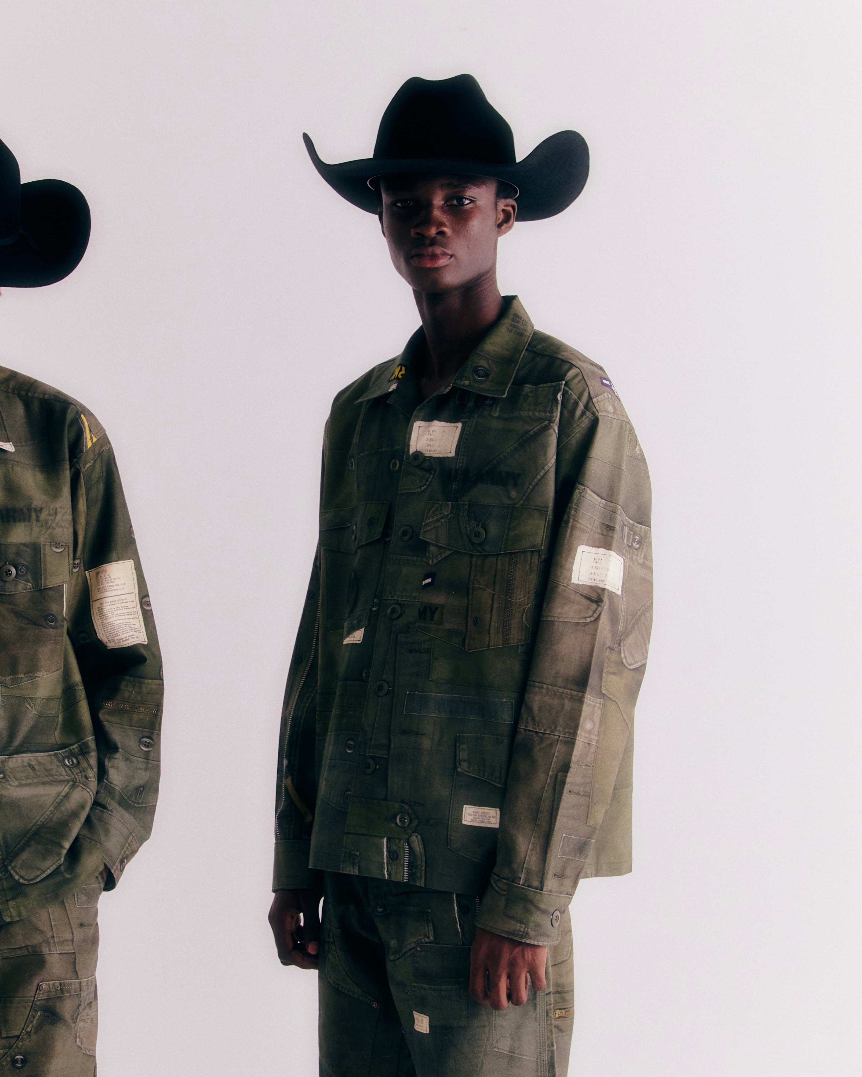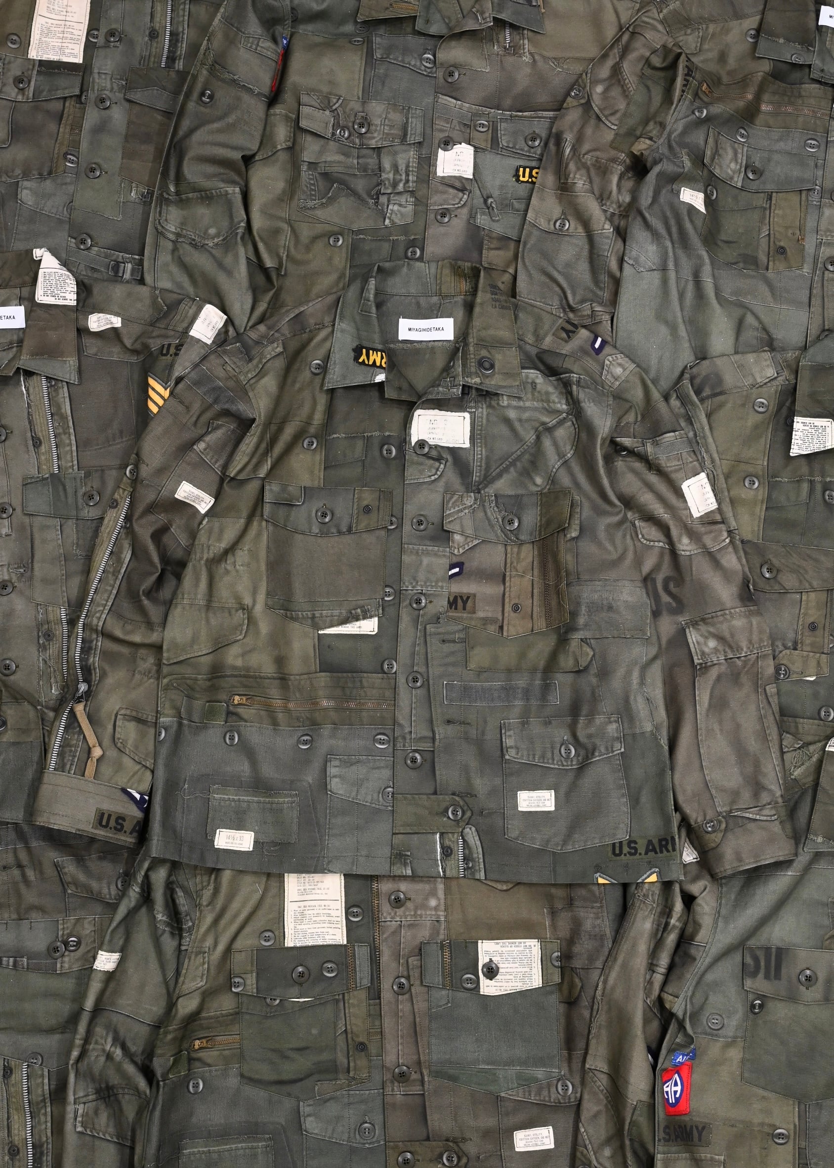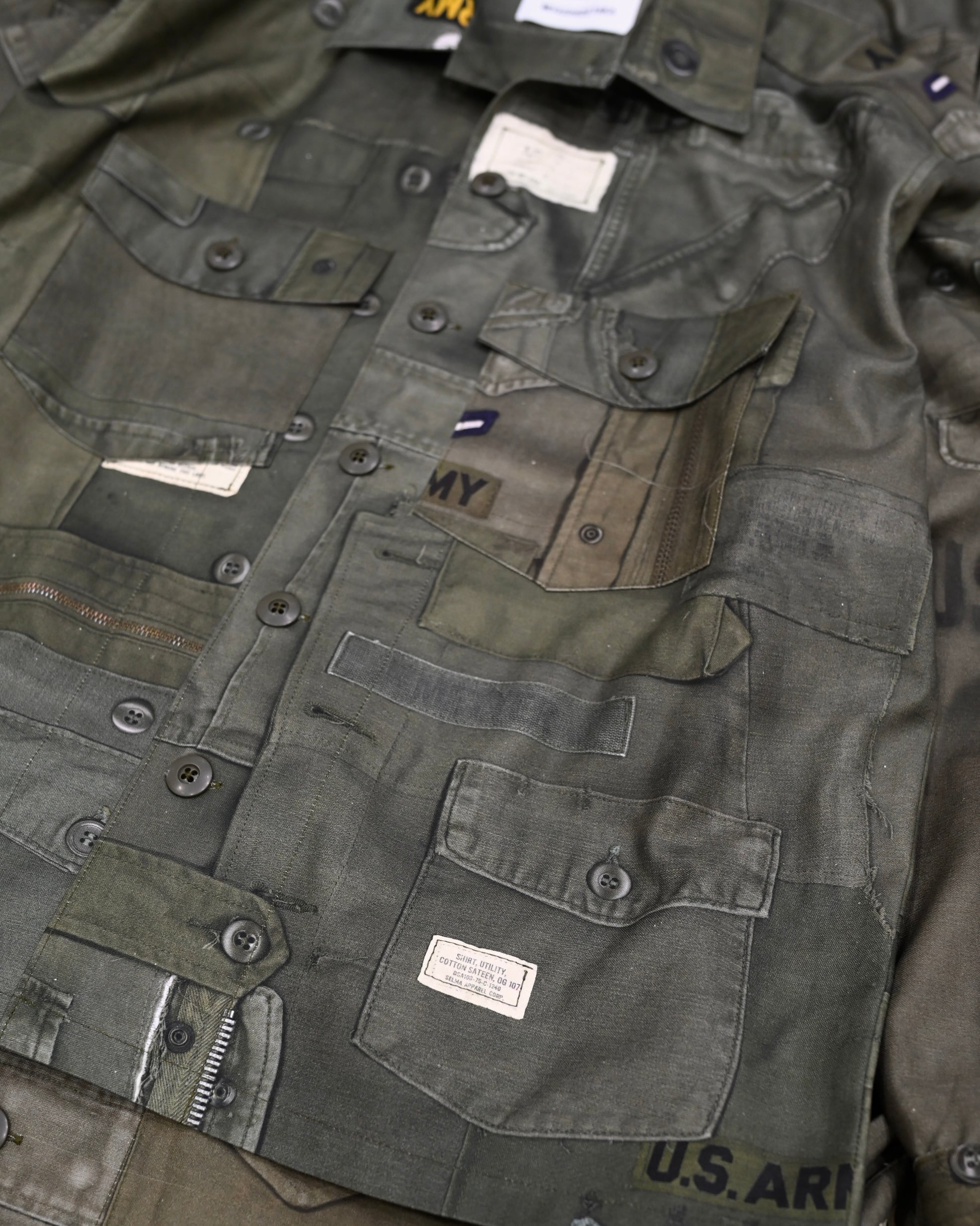 デザイナー自身が古着のミリタリー生地をパッチワークし縫製、その生地をプリントに落とし込んだシャツ。