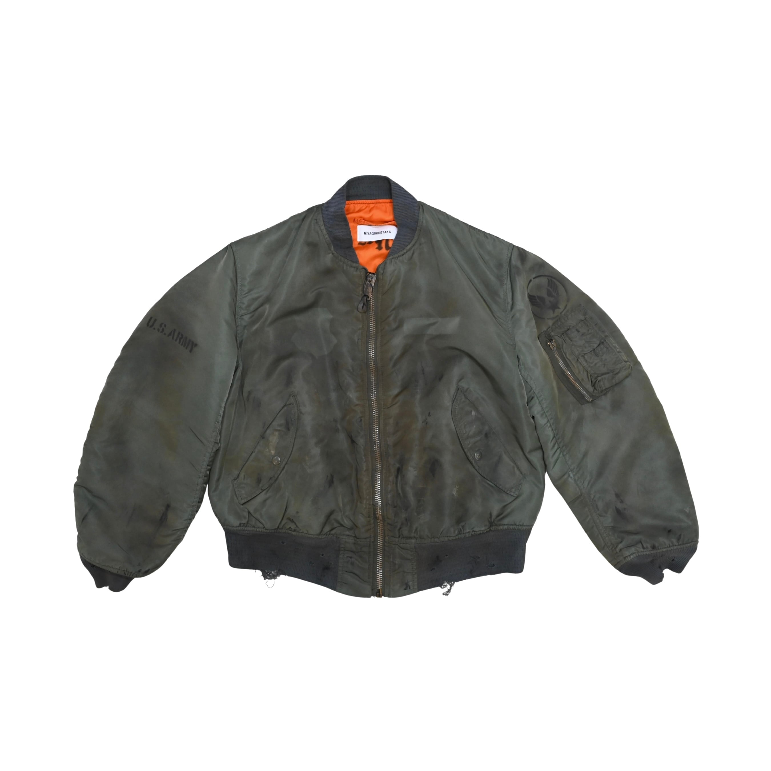 古着のフライトジャケットにステンシルやヴィンテージ加工を施した一着。3色のスプレーで奥行きを出し、手作業で穴あけや汚し加工を一点一点行っている。