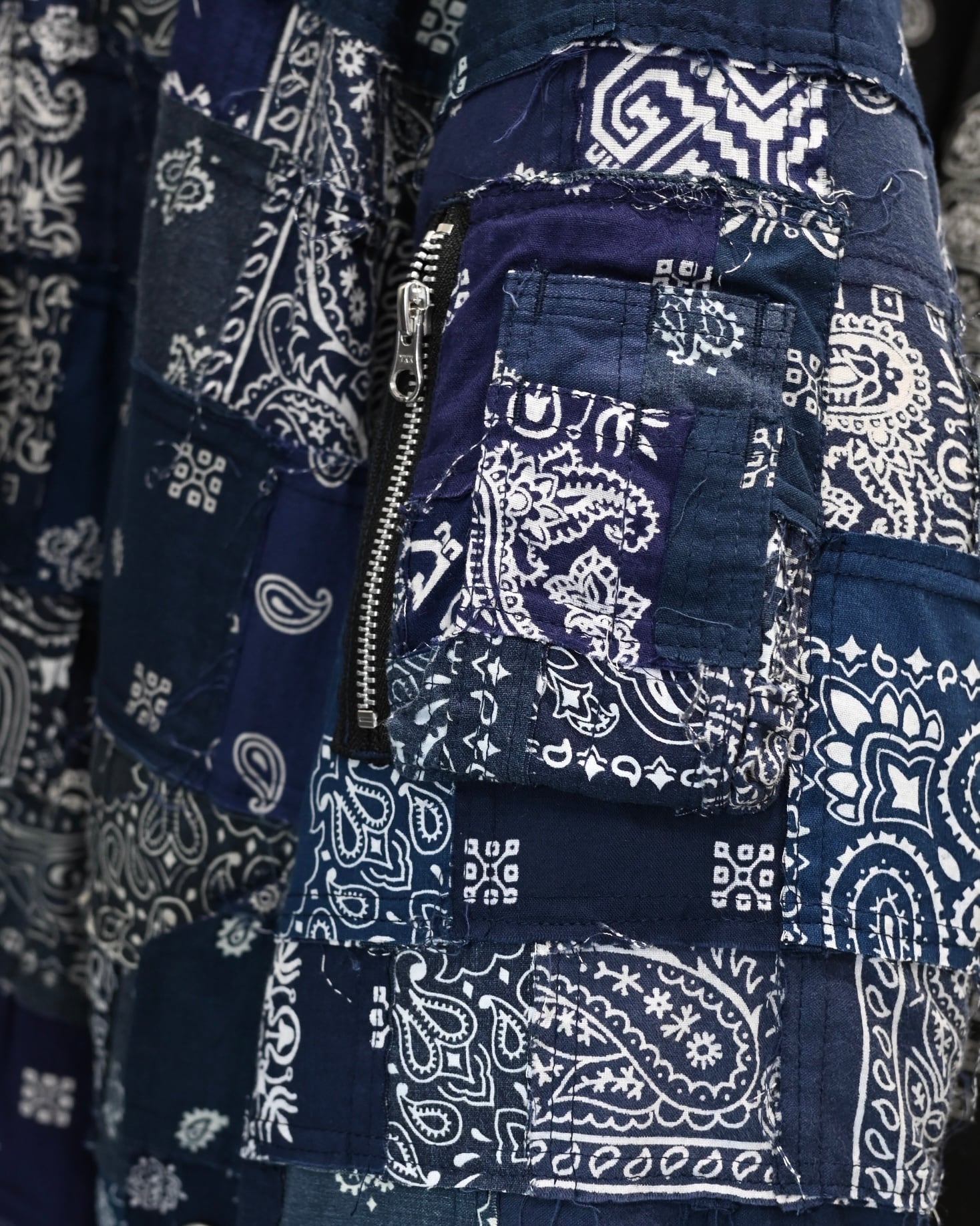 バンダナを大小不揃いのサイズでパッチワークにした生地を使っています。