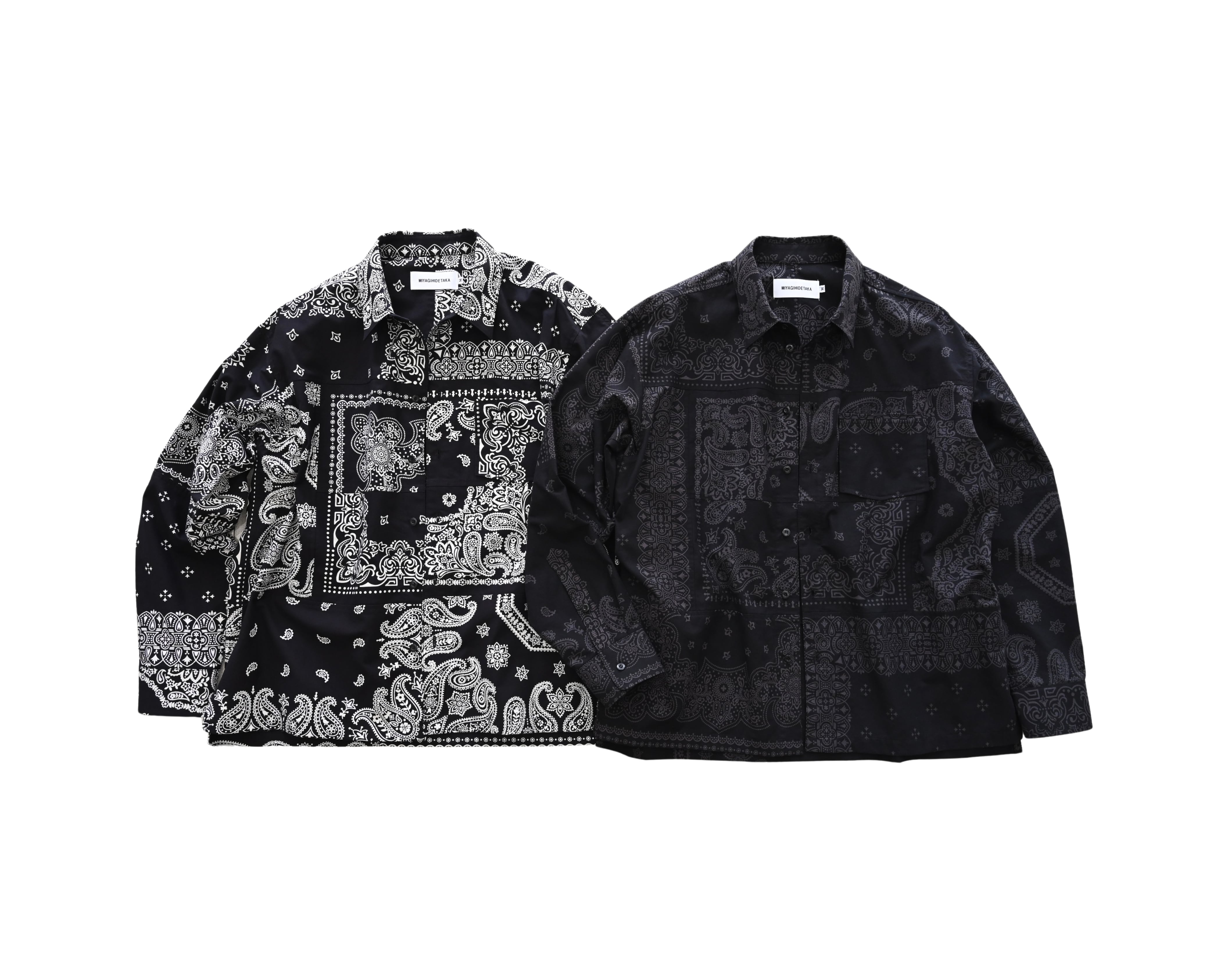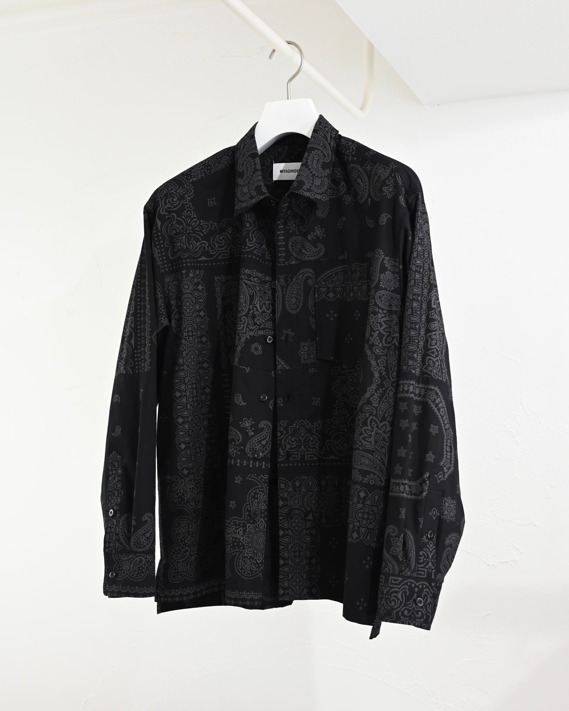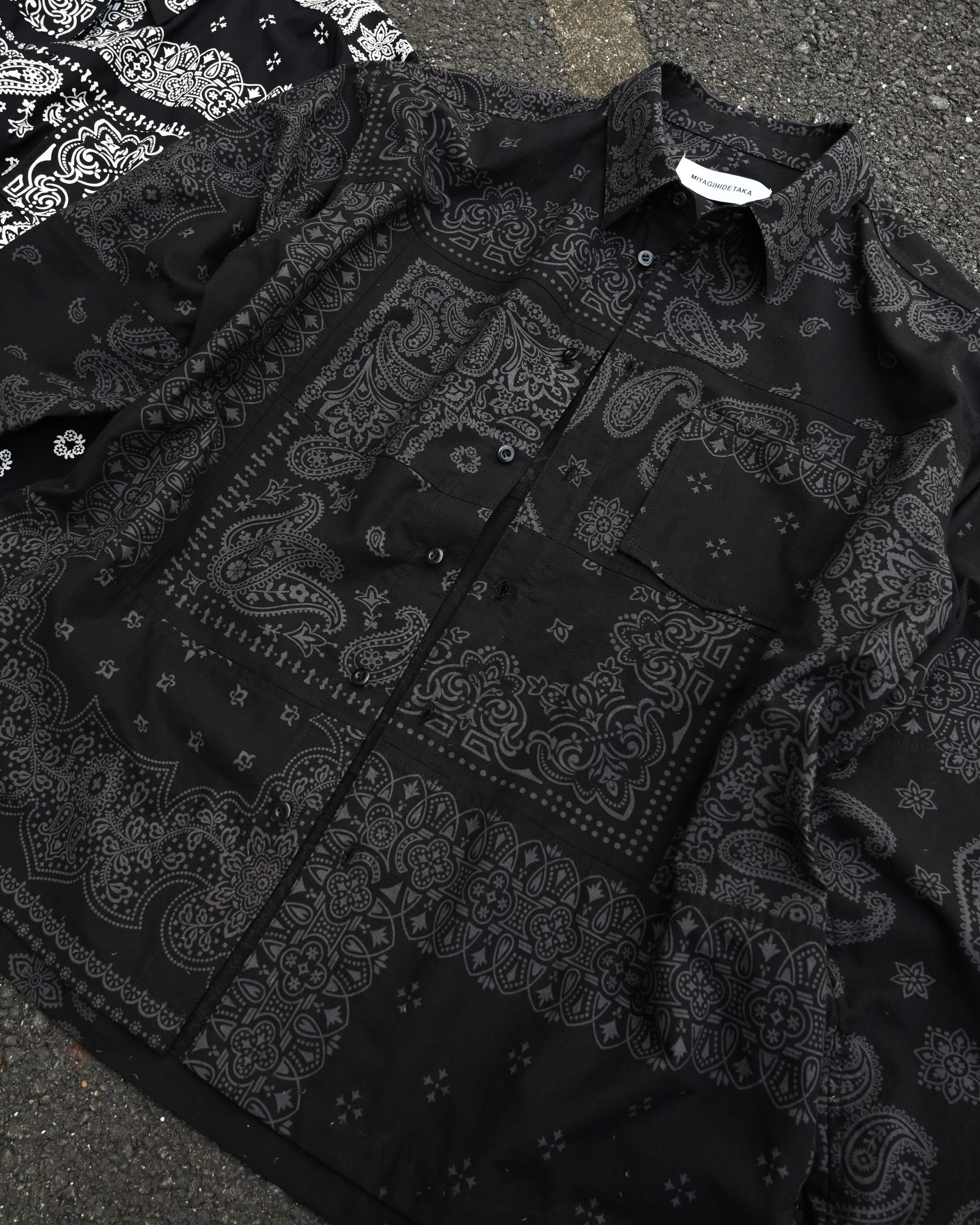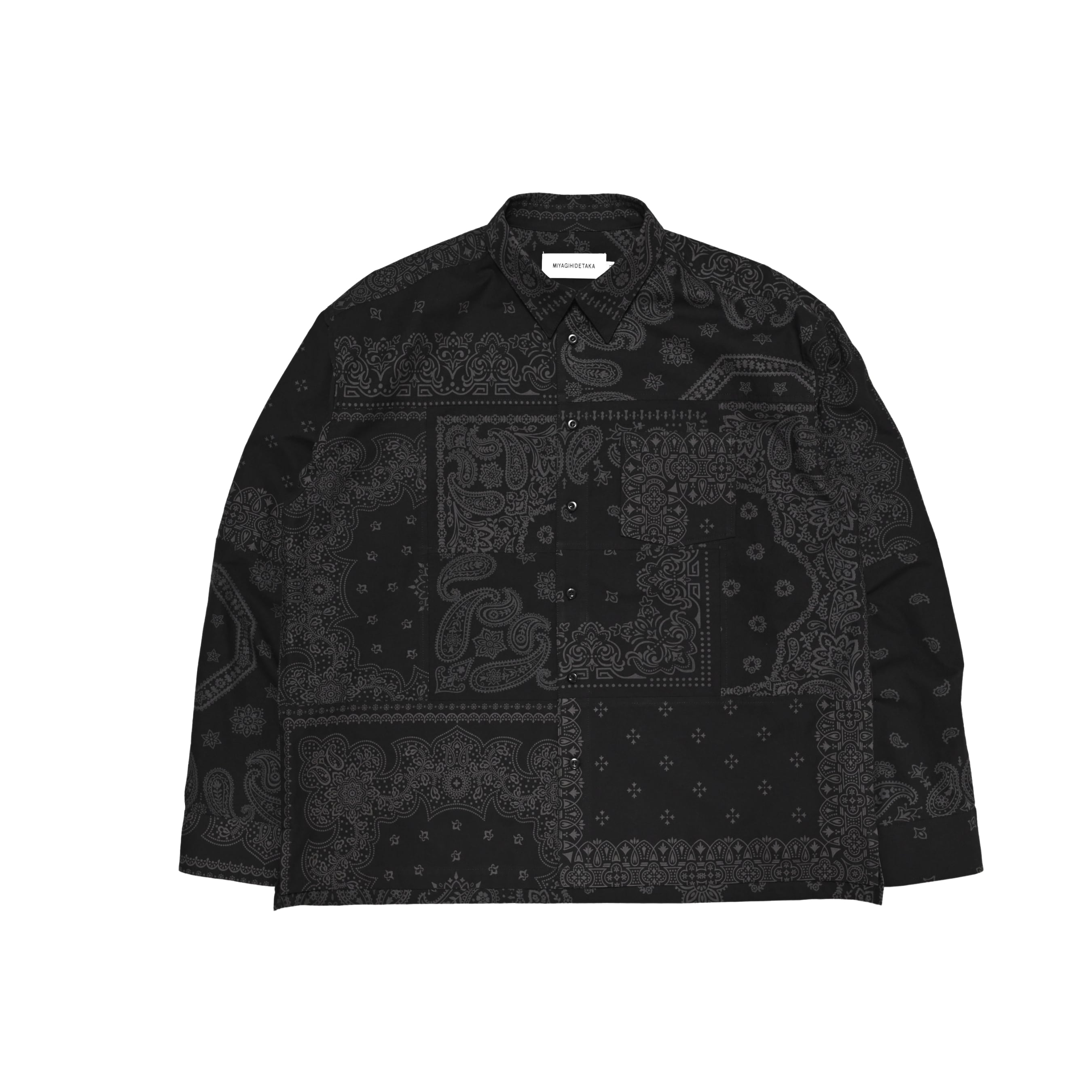 MIYAGIHIDETAKA Original Bandanaを使用したパッチワークシャツ。黒染めをしています。