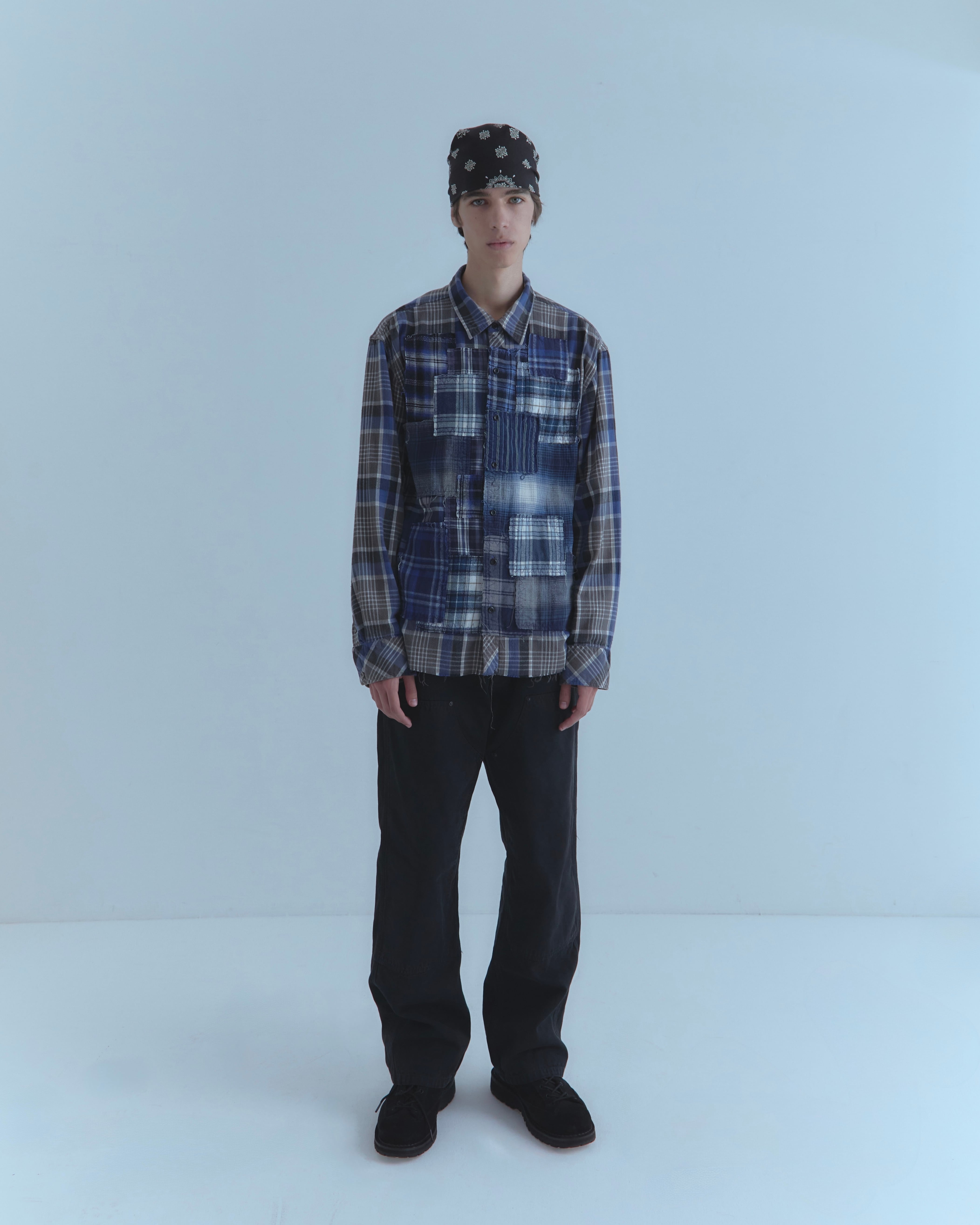 16種類のネル柄を組み合わせたパネルパッチワークの一着は、すべてが一点もの。ギザステッチ