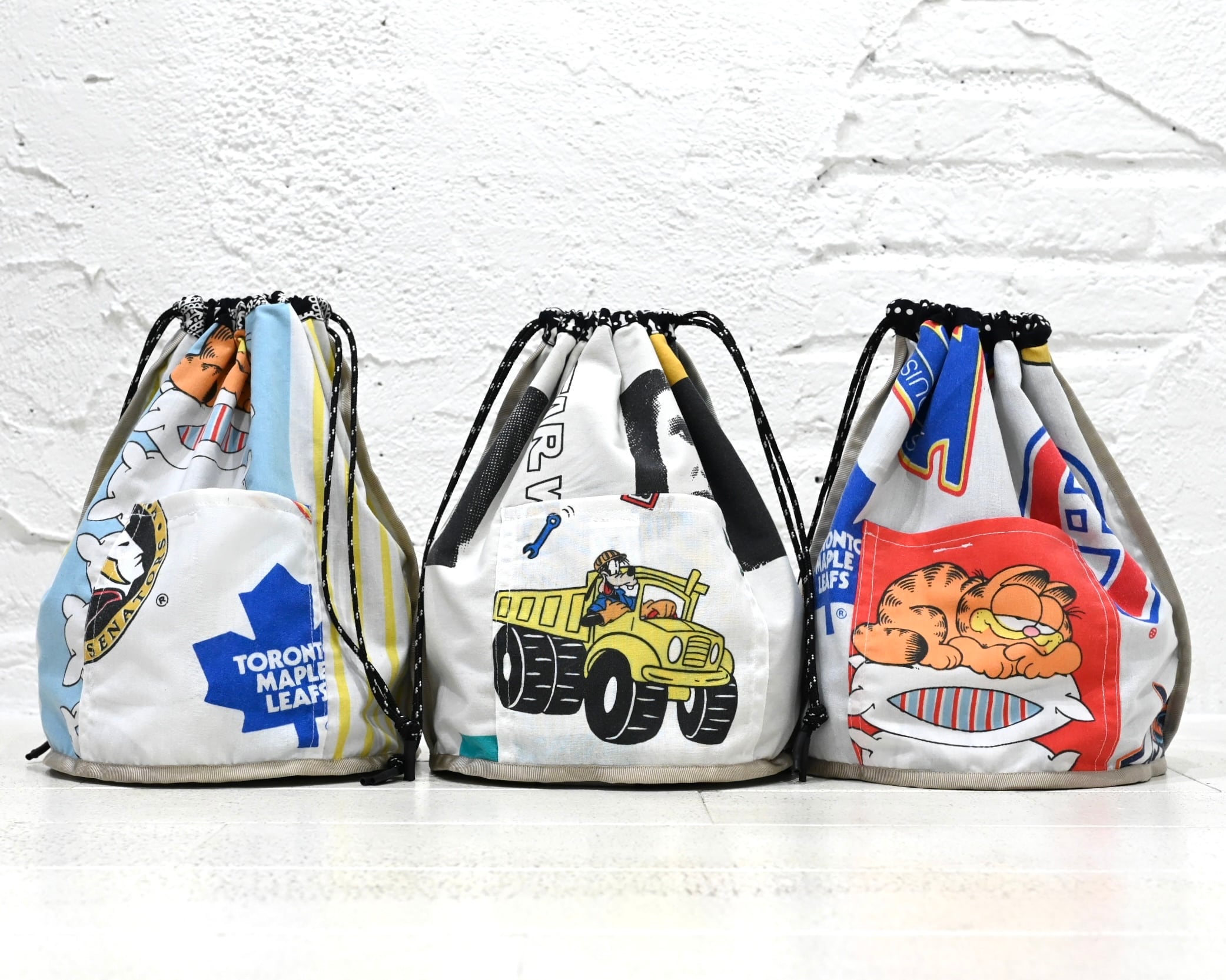リバーシブル仕様の巾着バッグ。