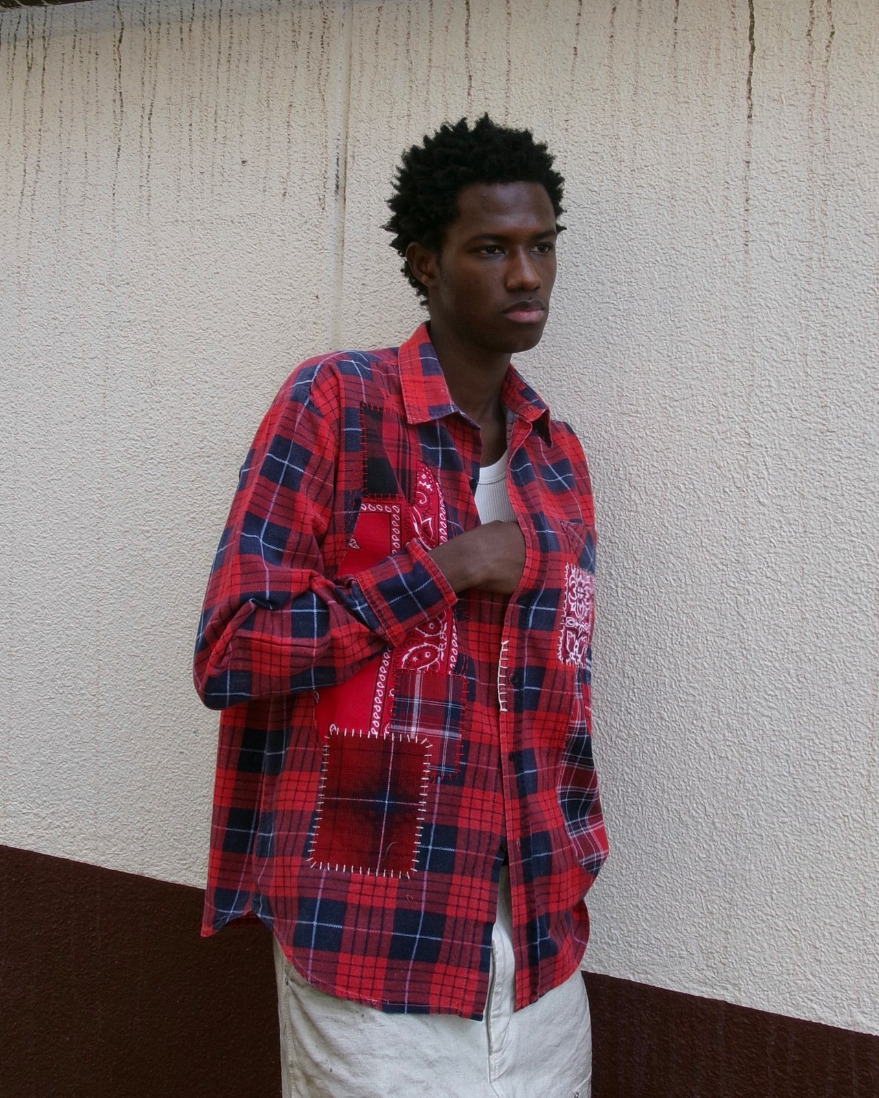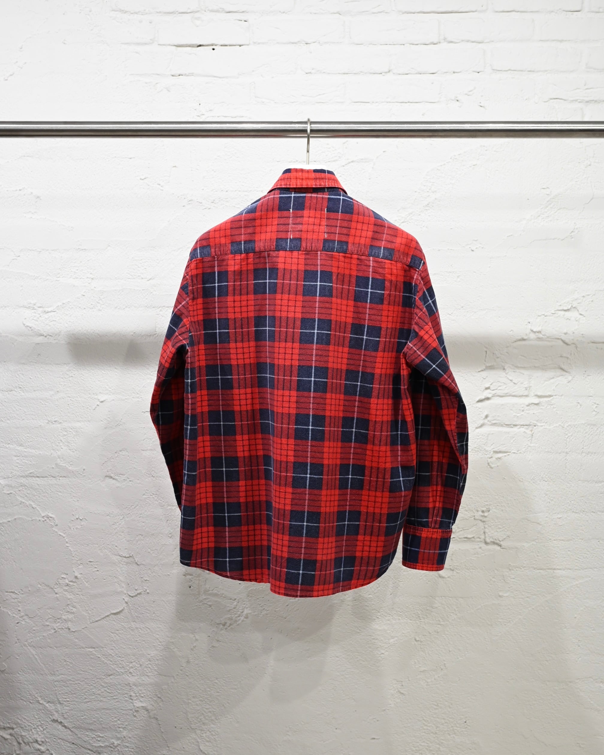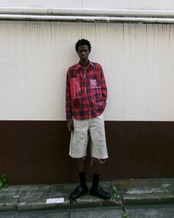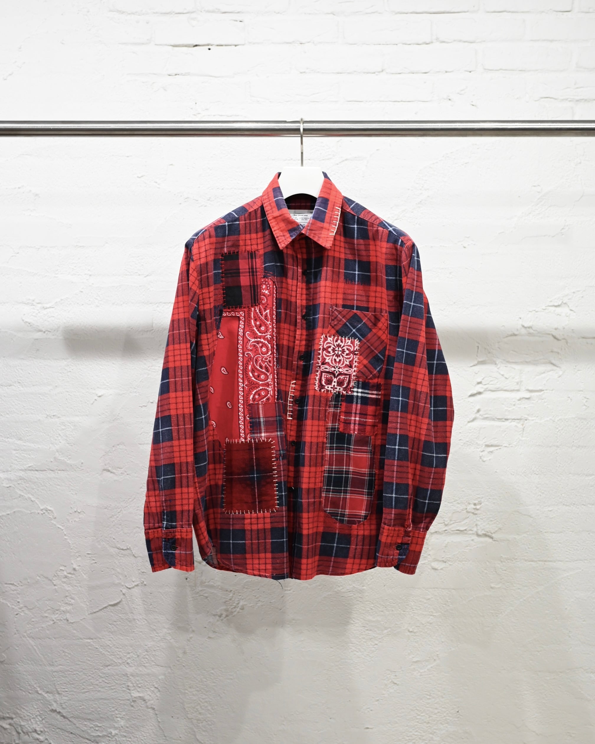 古着のネルシャツとバンダナをベースにした、MIYAGIHIDETAKA/Rafuのシグネチャースタイルのリメイクシャツ。