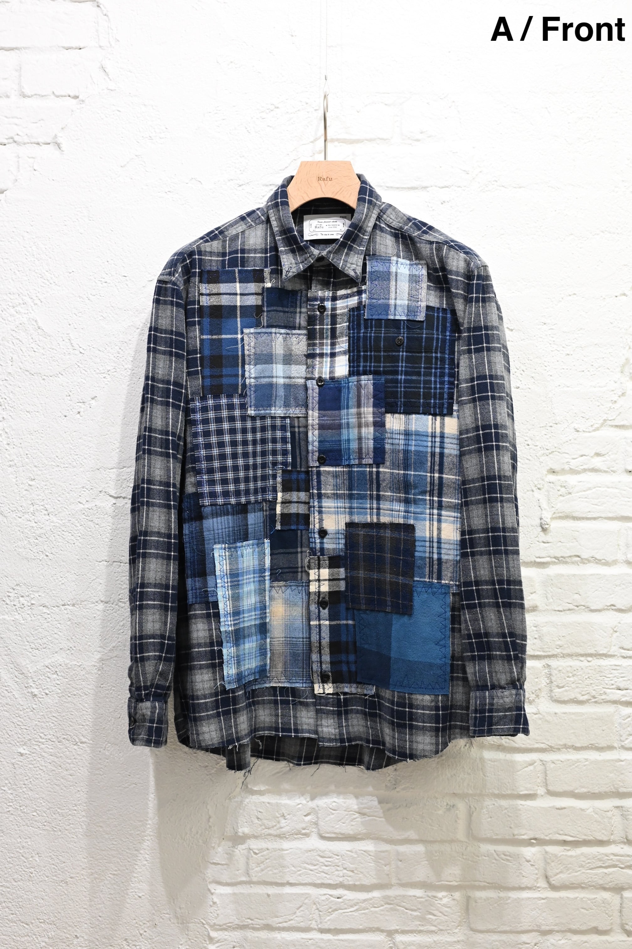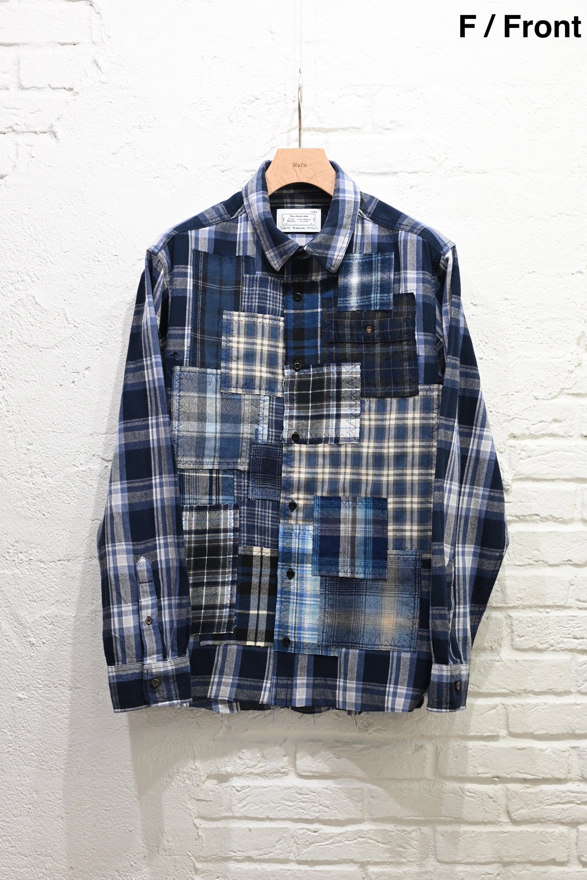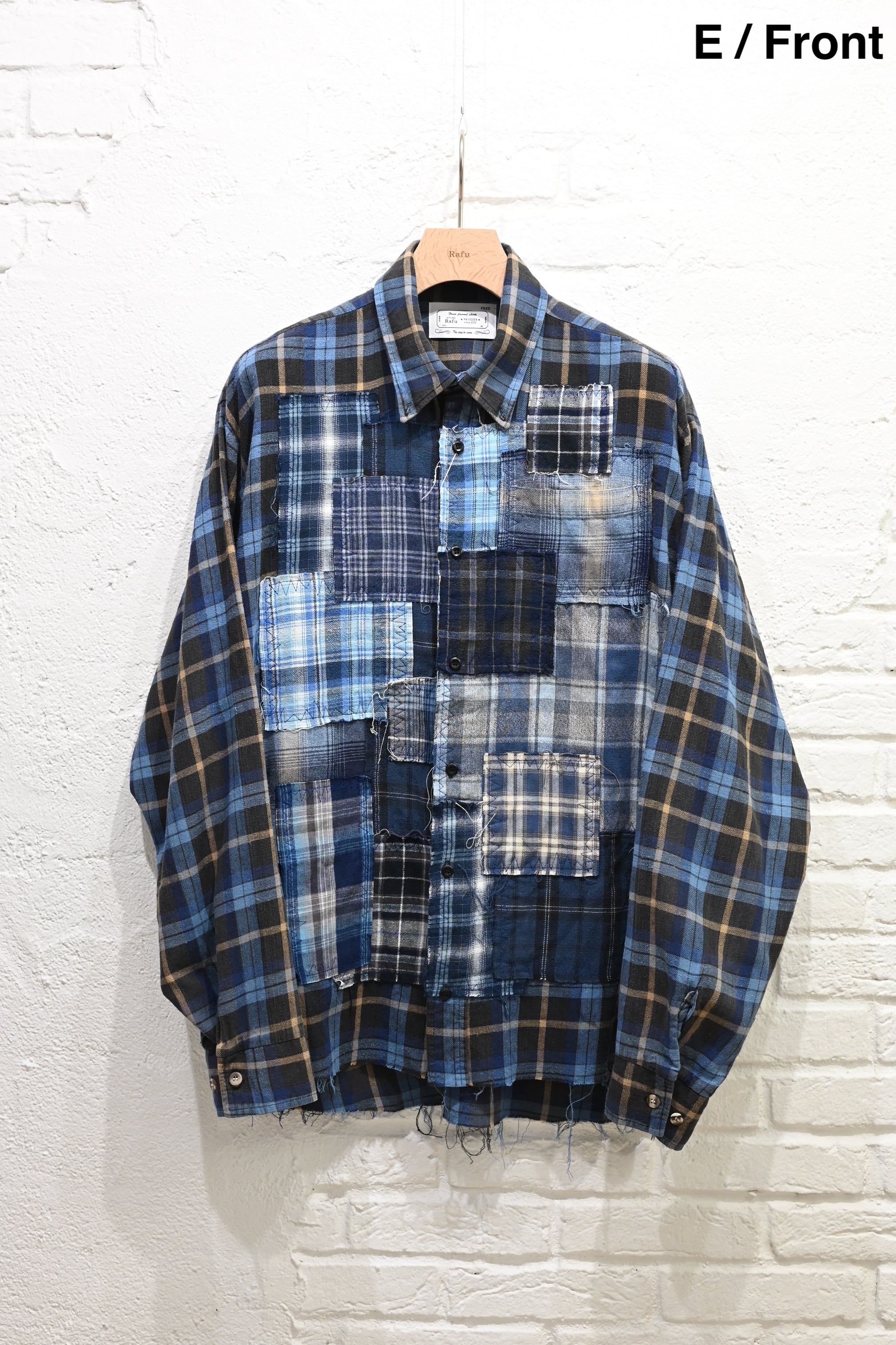 16種類のネル柄を組み合わせたパネルパッチワークの一着は、すべてが一点もの。ギザステッチ