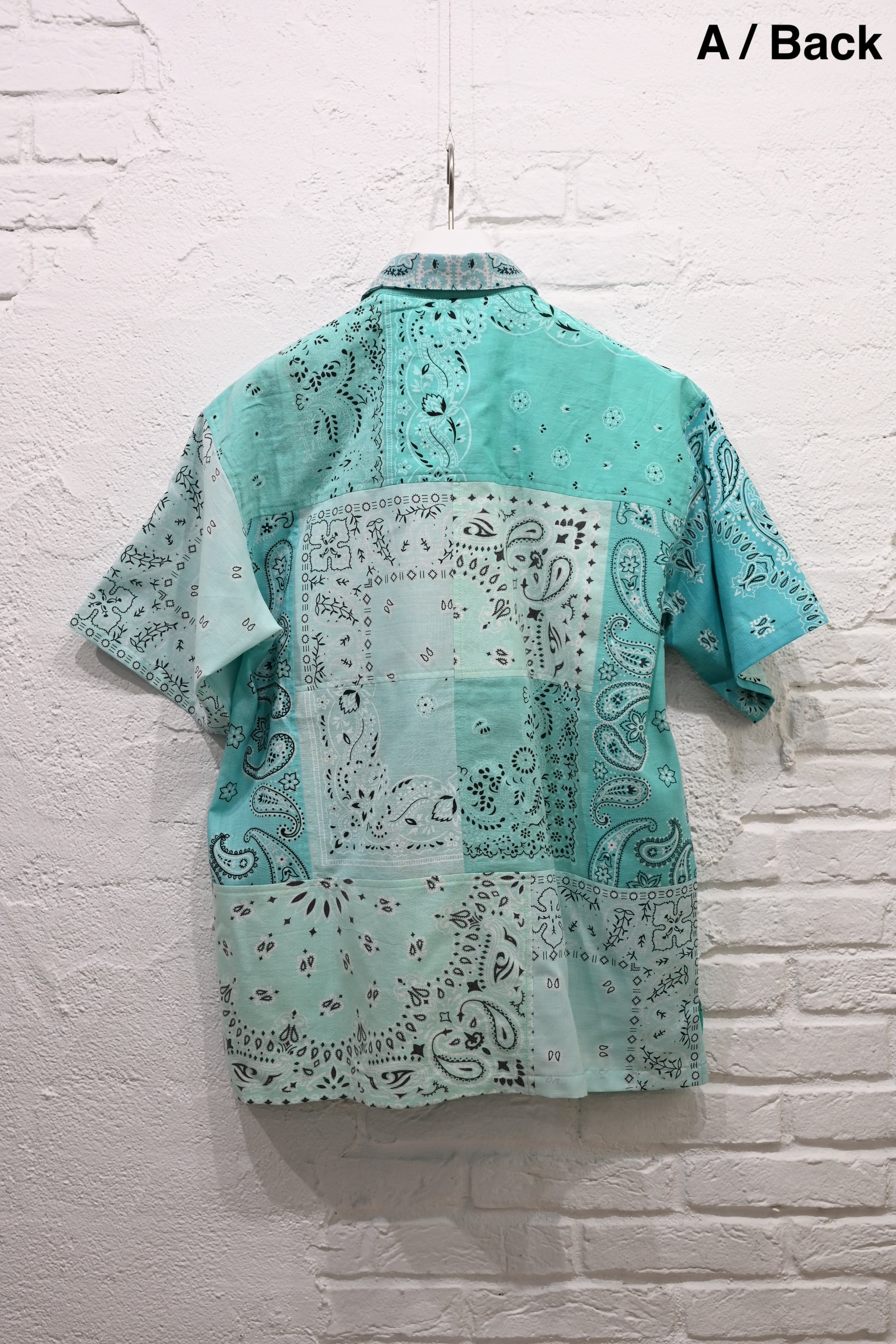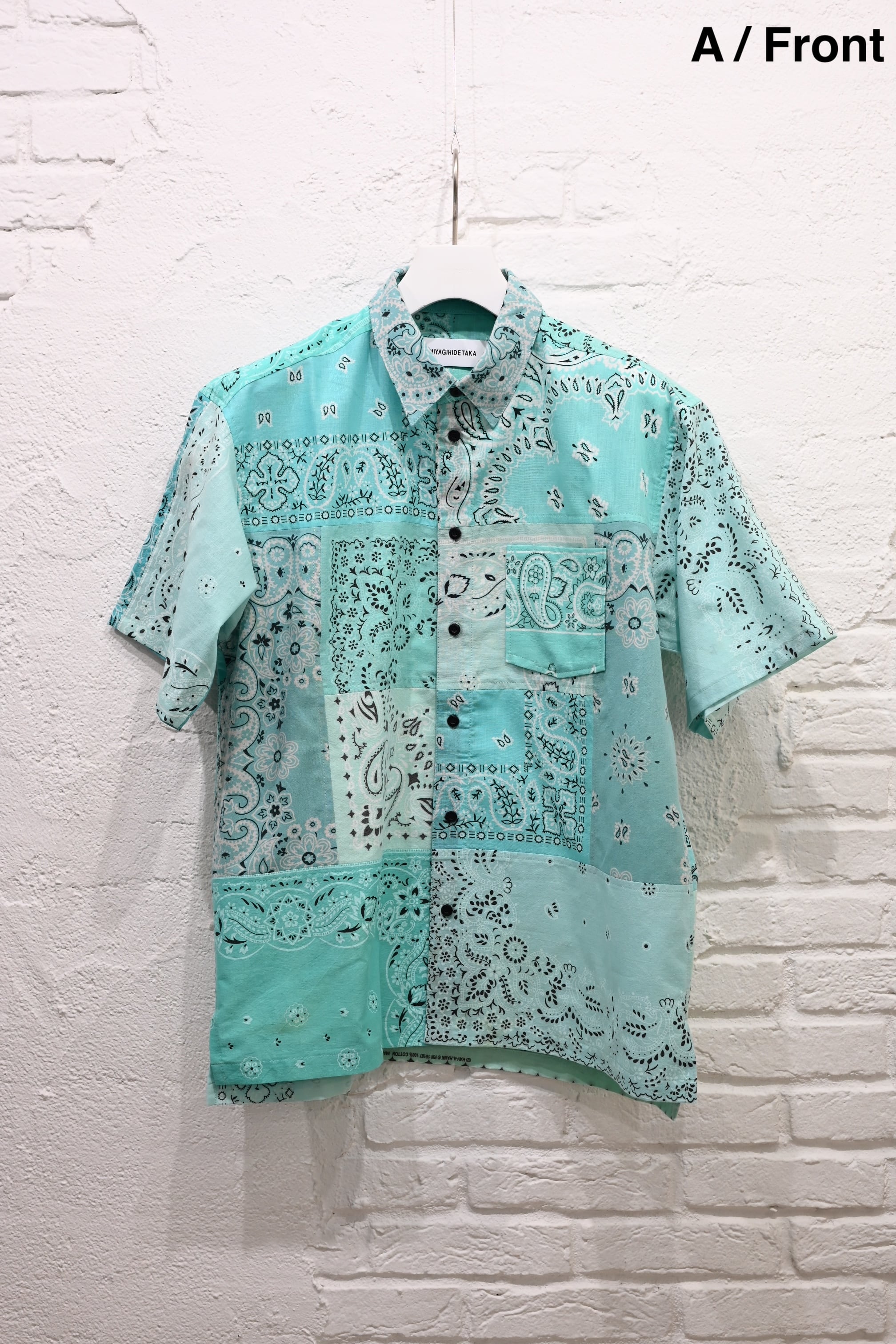 半袖シャツは11枚のバンダナを使用し、パッチワークで構成。配置や柄の向きに至るまで細かく設計されています。