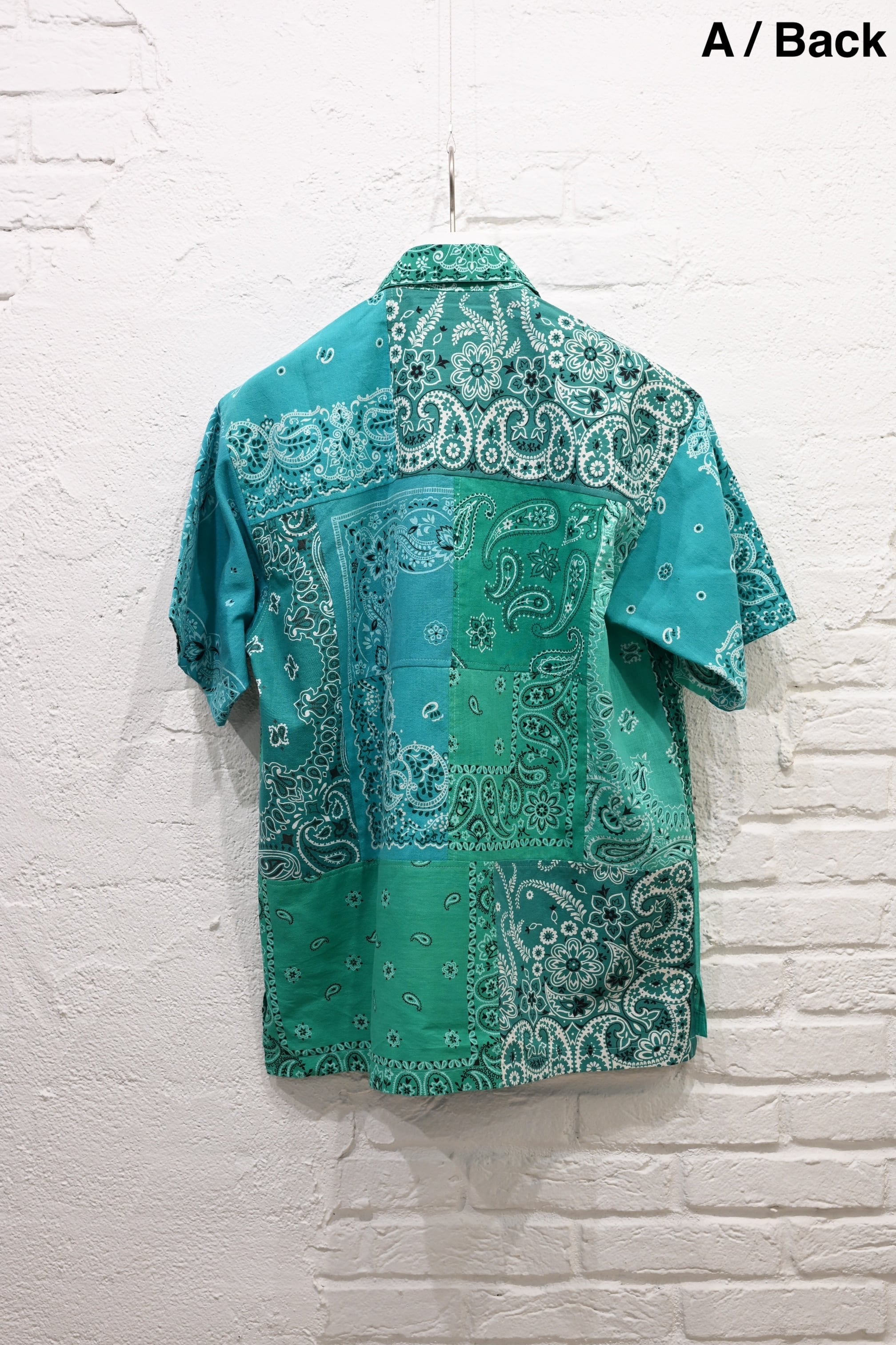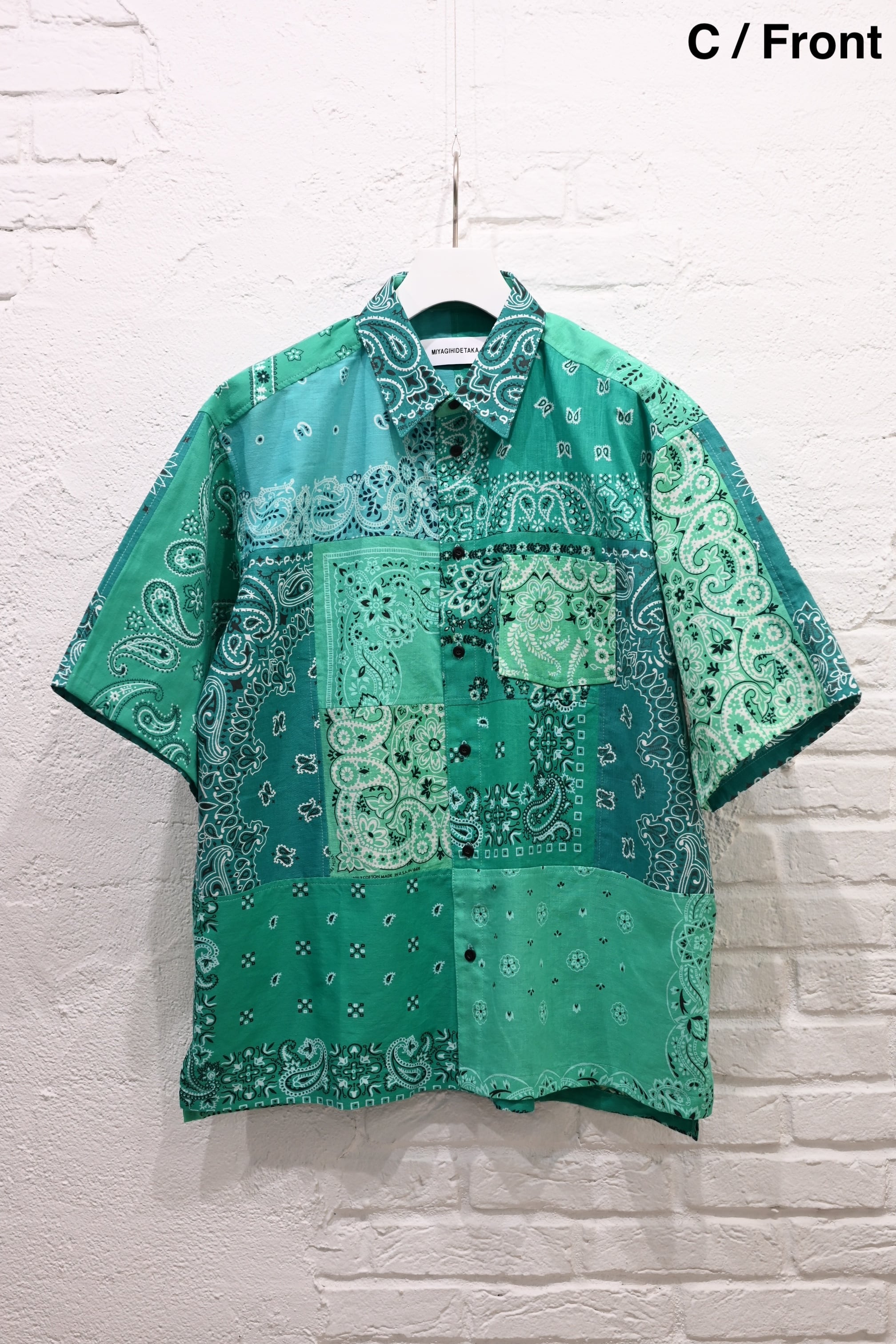 半袖シャツは11枚のバンダナを使用し、パッチワークで構成。配置や柄の向きに至るまで細かく設計されています。
