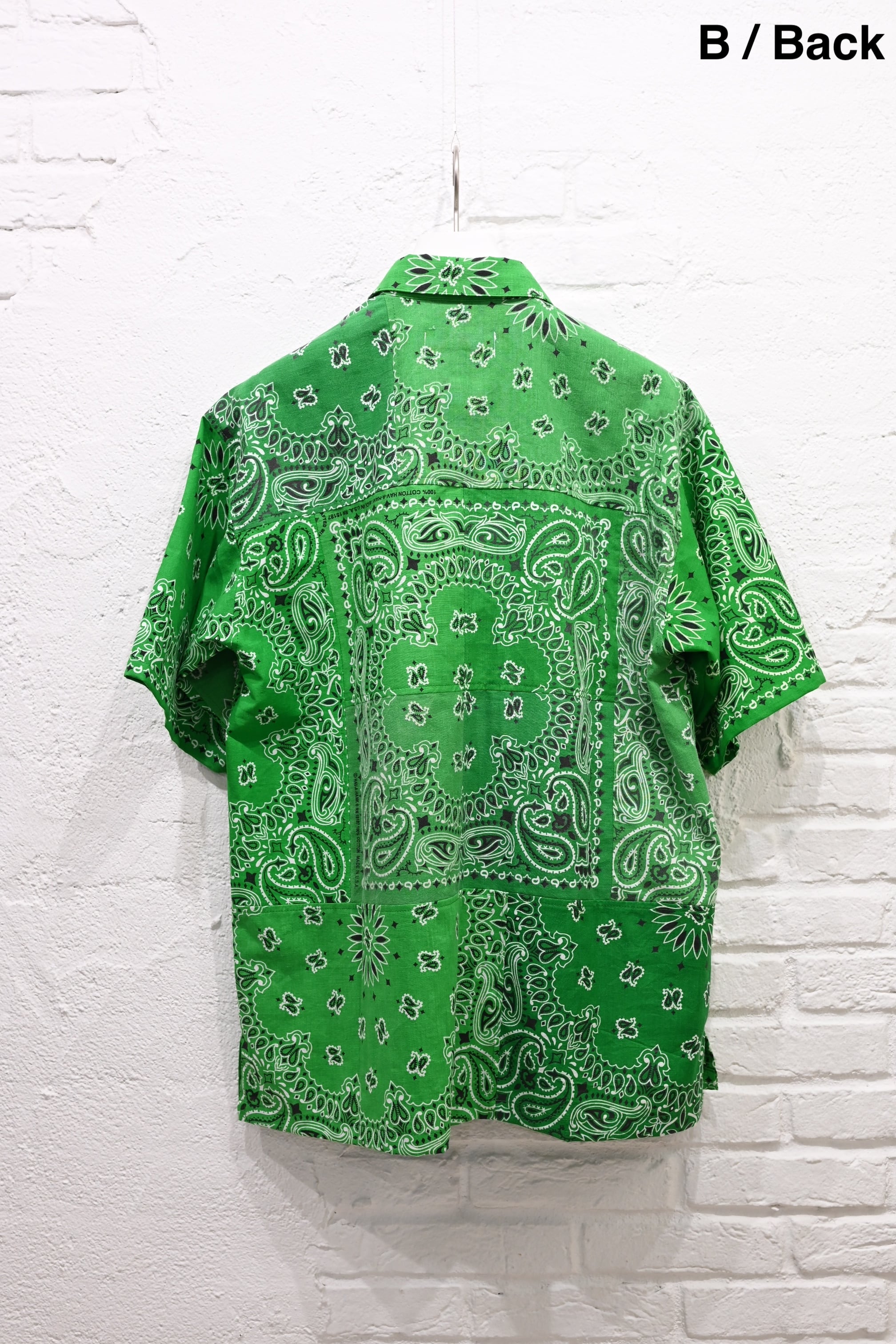 半袖シャツは11枚のバンダナを使用し、パッチワークで構成。配置や柄の向きに至るまで細かく設計されています。